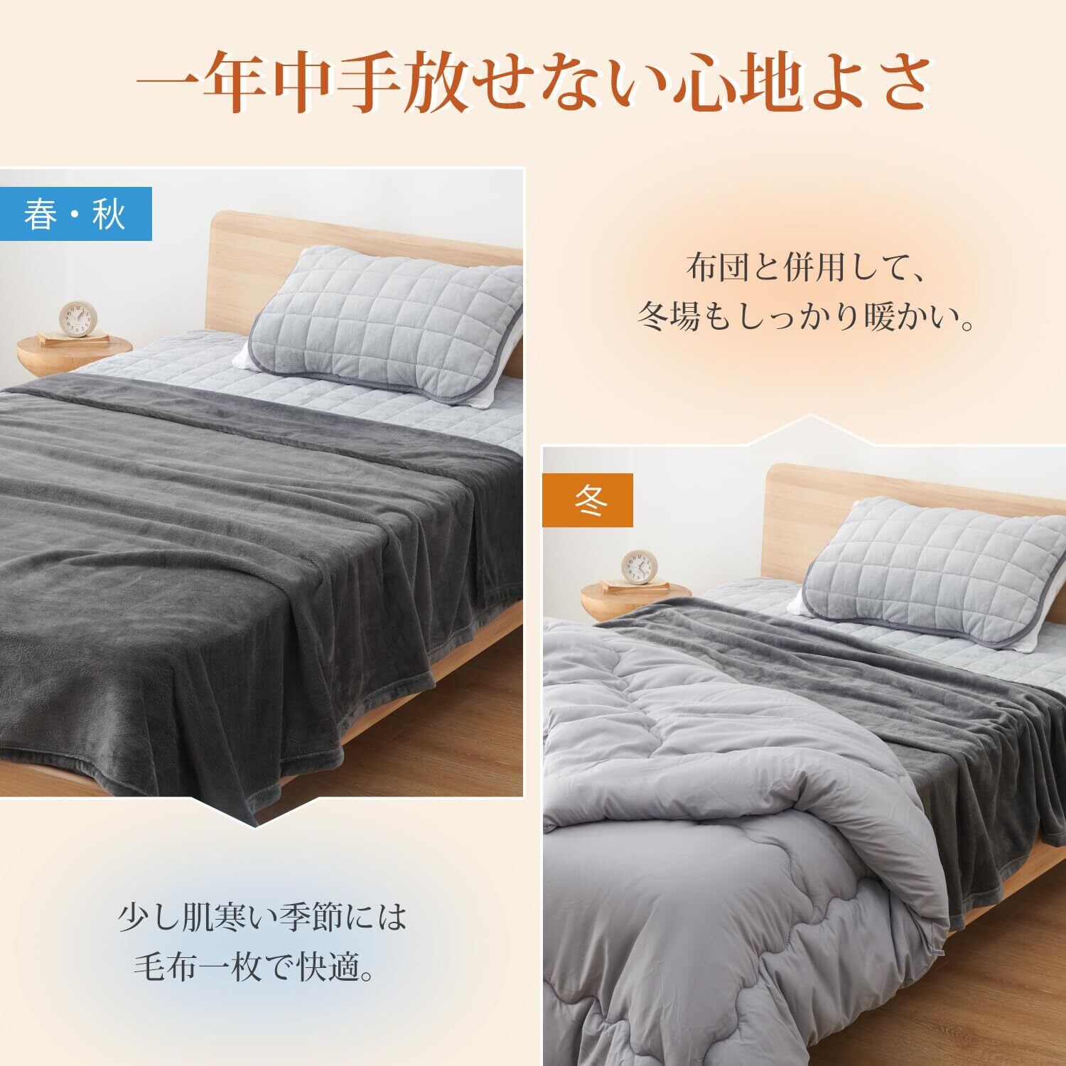 <保温力良い>軽量なのに、すごく柔らかくて温かいです。 春・夏・秋には一枚で気持ち良くお休みいただけます。冬場は布団の中掛けとして、重さを気にせず重ねて暖かく使っていただけます。