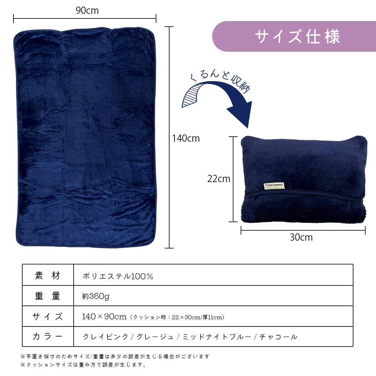【商品仕様】サイズ:140cm×90cm(クッション時:22cm×30cm)/重量:約360g/素材:ポリエステル100% ※圧縮袋に入れて出荷されるため、開封直後はぺったんこですので、本来の風合いに戻るまで少々時間がかかります。また、起毛素材の特性上、ケバや糸くずが発生しやすいので、最初のご使用前に洗濯するようお願いいたします。