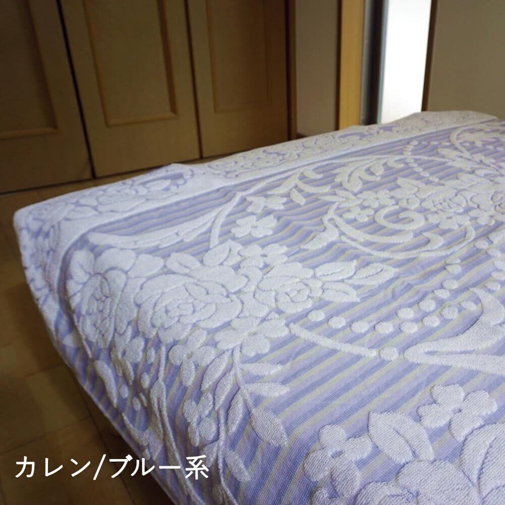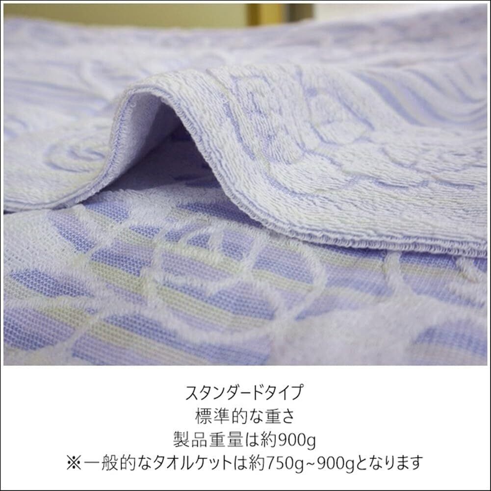 こちらのタオルケットは、ジャガード織を採用しており、美しい模様が特徴です。吸水性に優れ、汗をかく季節でもさらっとした快適さを提供します。夏の肌掛けはもちろん、冬の中掛けとしてもご利用いただけますので、オールシーズンでお使いいただけます。