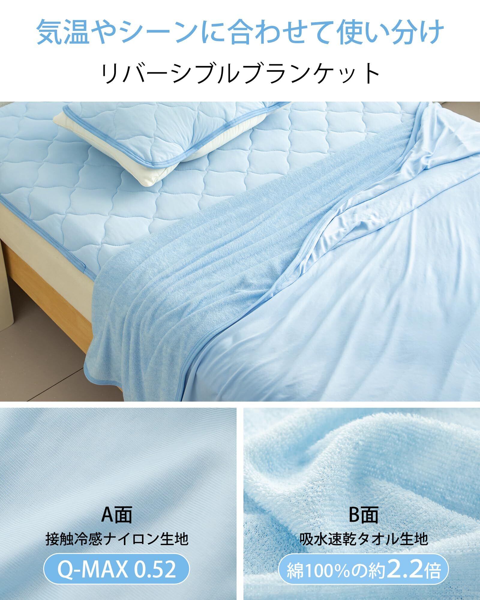【リバーシブルで使い分け自由】表はひんやり感のあるポリエステル100%、裏はやわらかなタオル地(パイル:ポリ50%・綿50%)。汗ばむ夜は冷感面でサラっと、空調の風が強い日や朝晩の冷えが気になる時はタオル面へ。手ざわりと体感温度を、日ごとの気温・体調に合わせて気軽に切り替えられます。