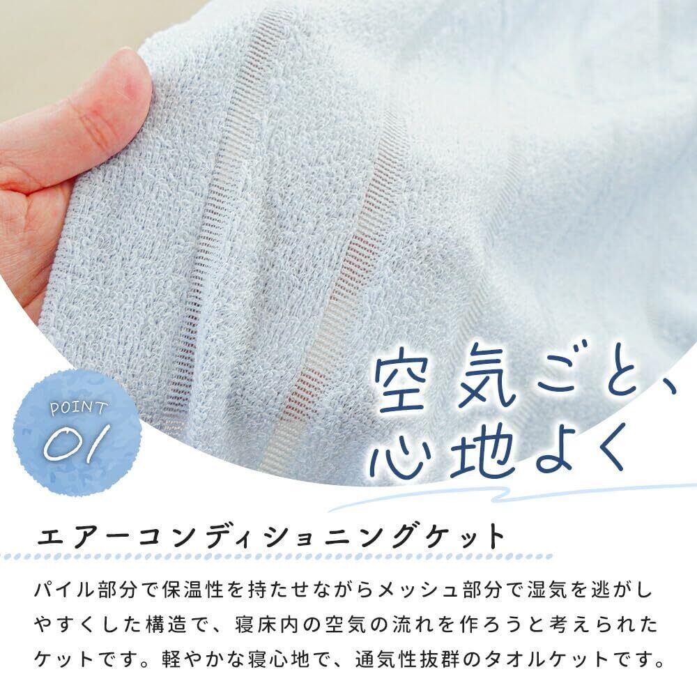 【ふわふわなのにムレ知らず。暑がりさんにおすすめのタオルケット】パイル部分で保温性を持たせながらメッシュ部分で湿気を逃がしやすくした構造で、寝床内の空気の流れを作ろうと考えられたケットです。軽やかな寝心地で、通気性バツグン!雲のようなやわらかさの「解撚糸」を使用。厳選した綿糸をポリエステル糸で撚りを戻し、毛羽立ちを抑えたふくらみのある糸に加工しています。程よい起毛とふんわりとした風合いで肌あたりの良いケットに仕上がりました。また、繊維の飛び散りを抑制してくれるため敏感肌やアレルギー体質の方でも安心して使えます。エアコンによる冷え対策から冬の重ね使いまで、一年中大活躍します。もちろんご自宅の洗濯機で丸洗いOK!老舗寝具メーカー「ロマンス小杉」の国産品質。高い技術と品質で、どなたにでも安心してお使いいただける1枚に仕上がりました。