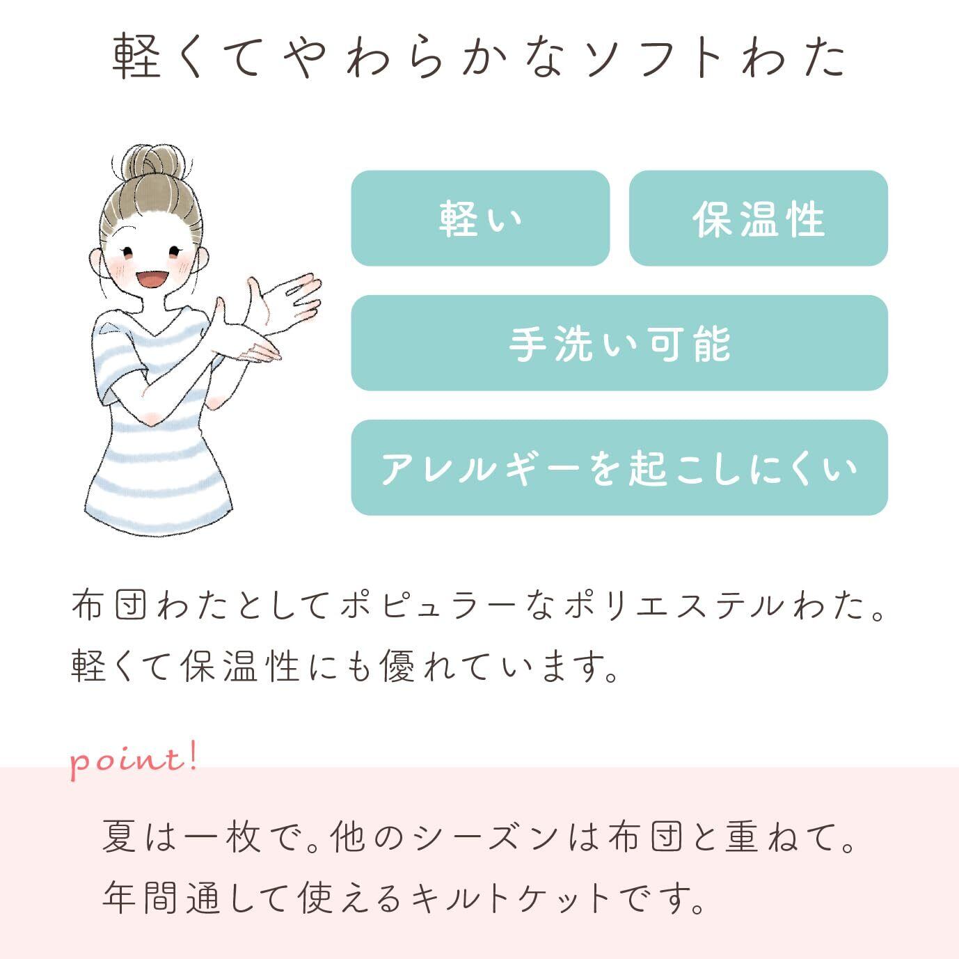 やわらかで軽いキルトケットは年間をとおして使いやすいアイテムです。肌に触れる表面は空気を含みふんわりと軽く、さらっとした肌ざわりの和晒しガーゼを使用しています。通気性・吸水性に優れたガーゼはむれにくく快適な使いごこちです。