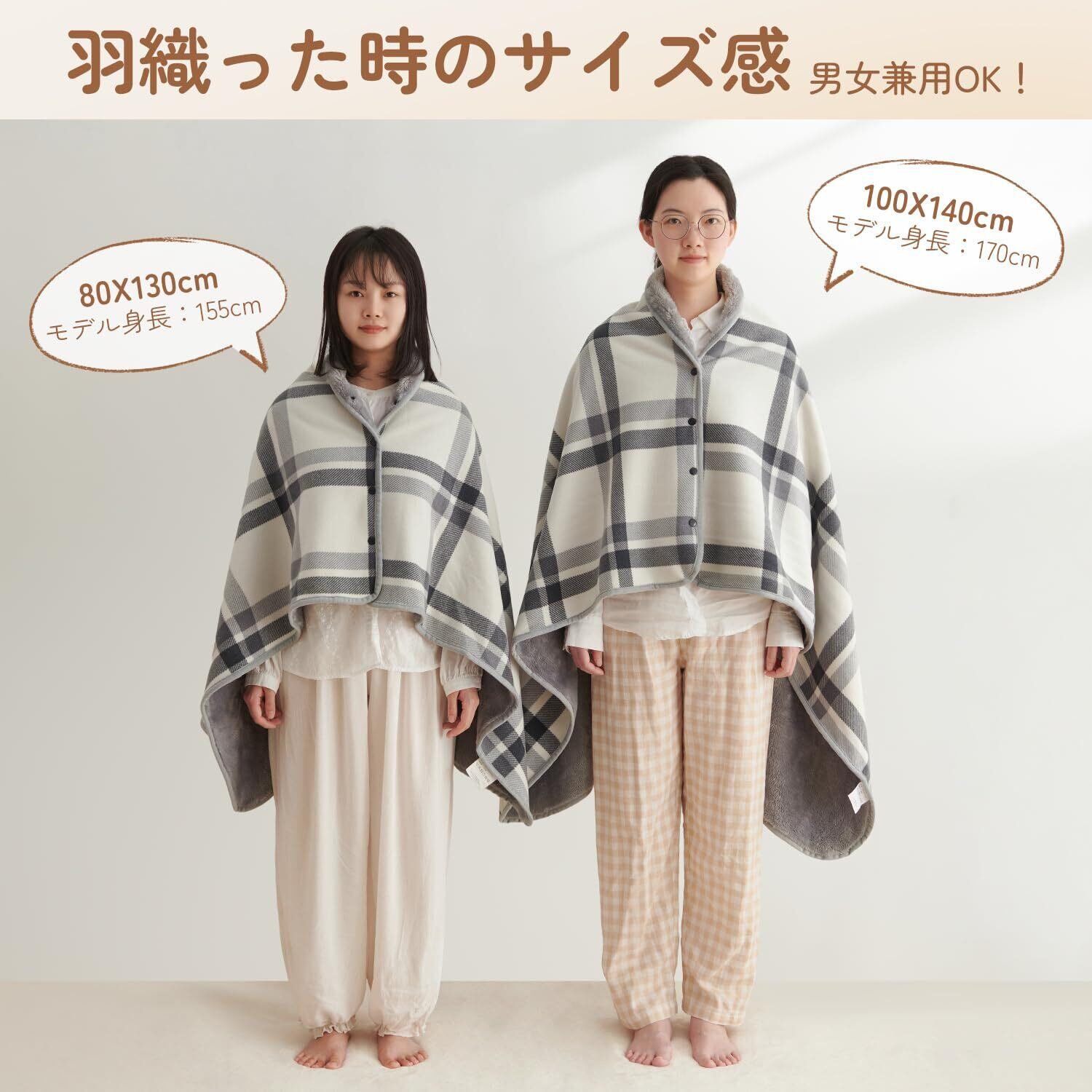 「ATOKAZO」のひざ掛けブランケットは、100×140cmの大判サイズで、肩掛けやひざ掛け、さらには腰巻きスカートとしても使える優れものです。ボタン付きで、簡単に着用できるので、どんな場面でも便利にご使用いただけます。