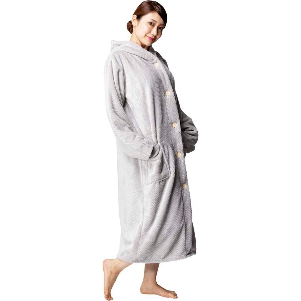 フード付きのデザインは、頭部も暖かく保ち、外出時やおうちでのリラックスタイムに最適。115cmの着丈は、下半身もしっかりと覆い、体全体を寒さから守ります。