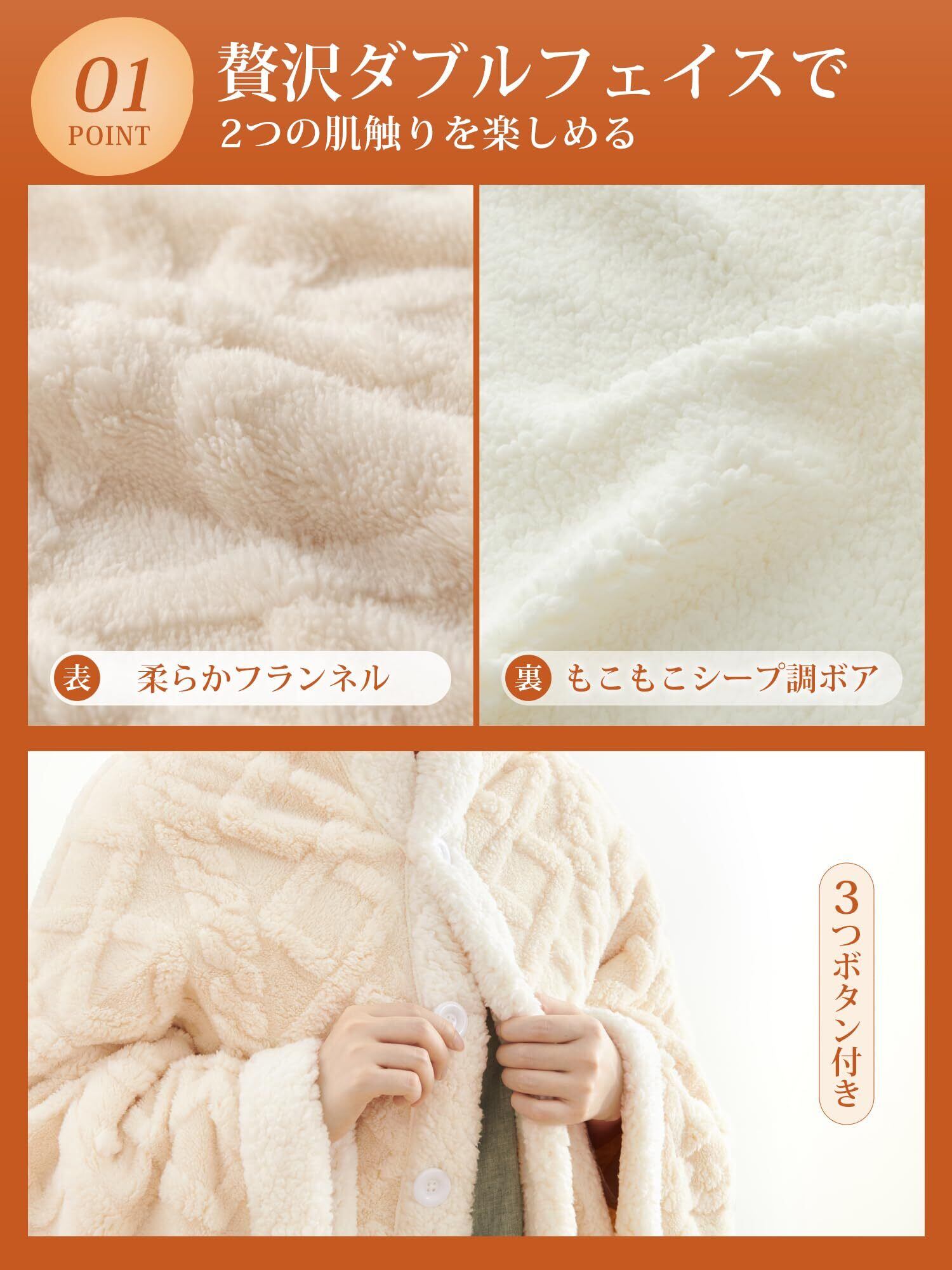 【贅沢二枚合わせで、極上のあたたかさ】柔らかいフランネルとシープ調ボアを二枚合わせにした贅沢仕様。空気をたっぷり含む構造で保温性が高く、寒い冬の夜も朝までぬくもりが続く。