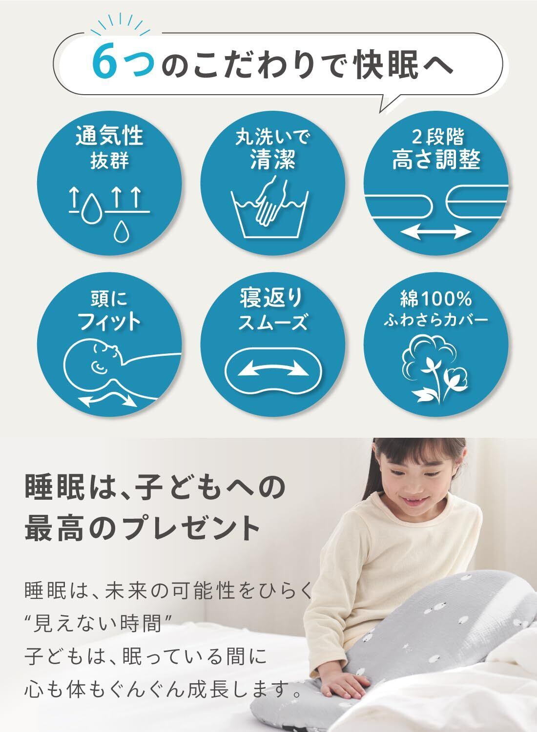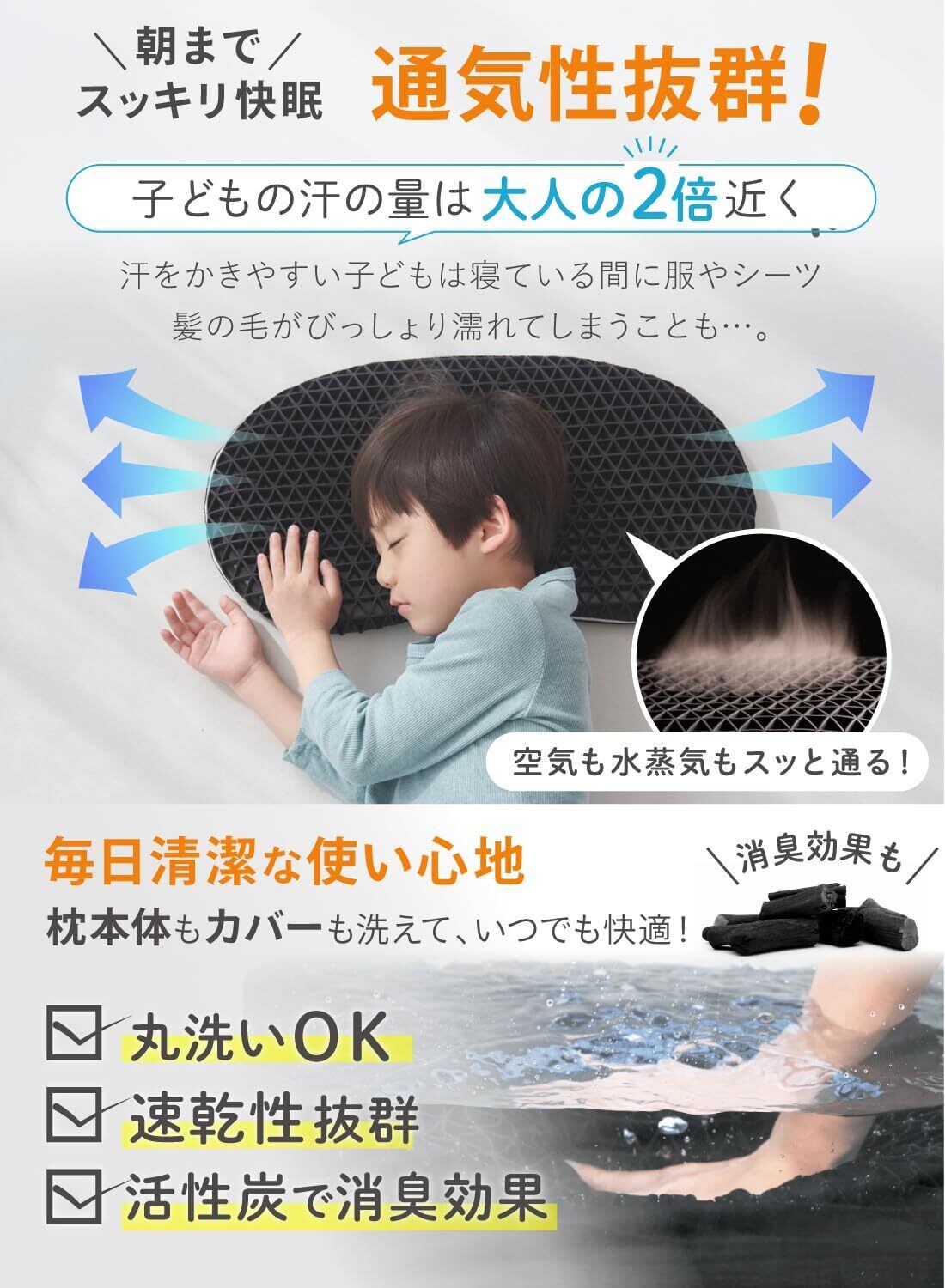 【ぷにょんぽにょん素材が頭にフィット】やわらかなTPE(熱可塑性エラストマー)素材を採用。丈夫でやわらかく、しなやかな素材で頭をやさしくサポートします。 【通気性抜群!朝までスッキリ快眠】実は子どもの汗の量は大人の2倍近く!なので眠っている間に汗で服やシーツ、髪の毛がびっしょり濡れてしまうことも。汗をかきやすい子どもが快適に眠れるよう、枕本体は熱や湿気を通しやすい「三角格子構造」眠っている間の熱や湿気を逃して朝までスッキリ。 【丸洗い可能で清潔】枕本体もカバーも丸洗いOKなので毎日清潔にご使用いただけます。また、枕本体には消臭性のある活性炭を配合。寝汗や湿気によるイヤなにおいも吸着し防ぎます。