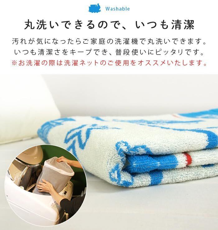 このタオルケットは家庭用洗濯機で丸洗い可能。洗濯ネットを使用することで、手軽にお手入れができ、いつでも清潔な状態を保ちます。忙しいママやパパも安心して使えます。