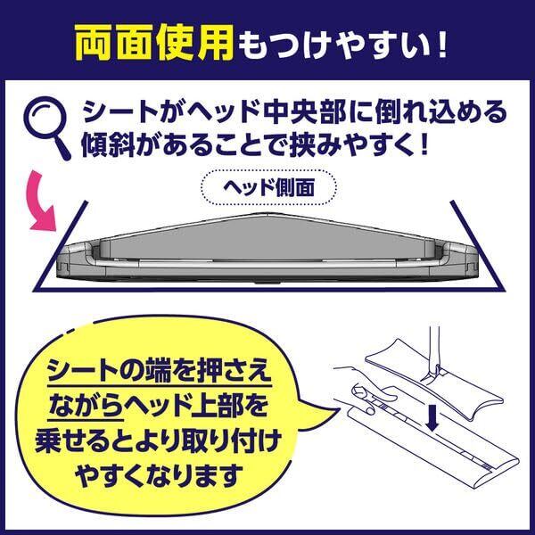 シート装着ワンタッチ!ベタベタ汚れグイッとふける! マグネット式でシートの装着かんたんワンタッチ!ぴったりフィットしてずれにくい!さらに、ヘッドの床への密着面積が126%※に。 ウエットシートに最適設計※でベタベタした汚れもゴシゴシこすらず、グイッとふけます。ヘッド裏面はマルチ捕集構造で縦横どの方向でもしっかり汚れを捕集。(※当社品比) フローリング(キッチン床)、クッションフロア(洗面所)、玄関たたきにおすすめ。柄を短くして網戸にも。