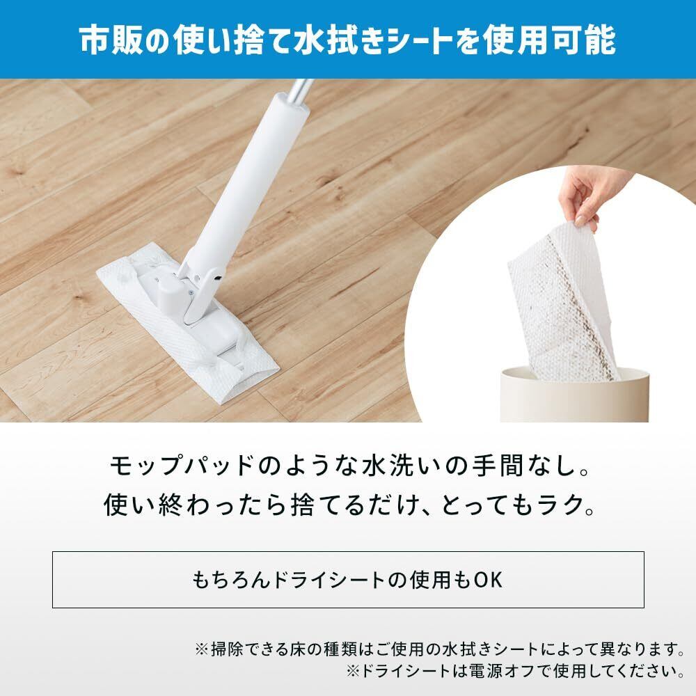 「アイリスオーヤマ 電動フロアワイパー」は、振動機能を搭載し、床の汚れをしっかりと落とします。市販のシートも使用可能なので、手持ちのモップシートを合わせて使うことができ、日常の掃除をより効率的にサポートします。
