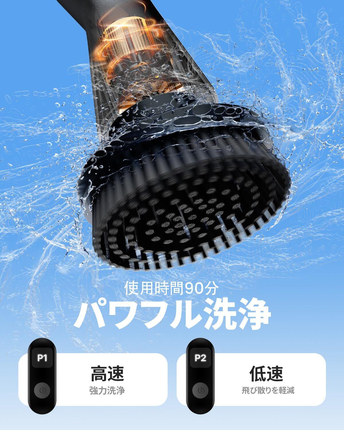 2段階のスピード設定が可能で、軽い汚れには優しいモード、頑固な汚れにはパワフルなモードを使い分けできます。掃除をするシーンに応じて最適なスピードで、しっかりと汚れを落とします。