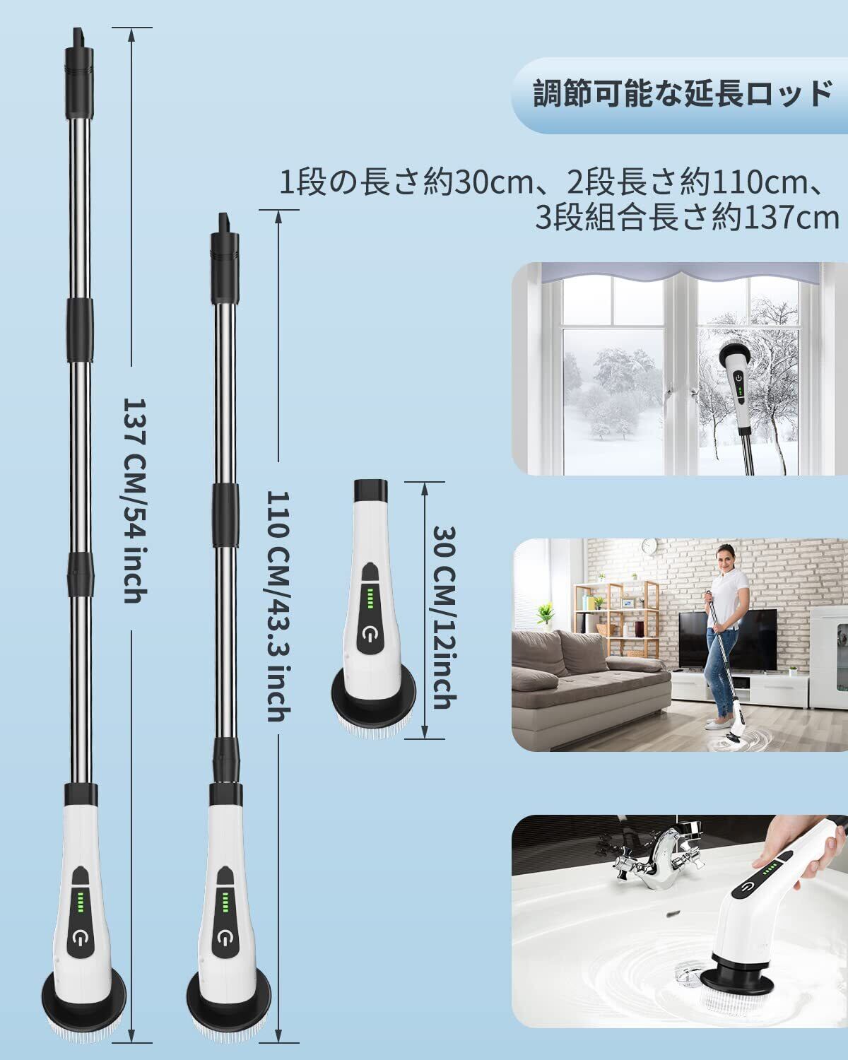 【 8つの替えブラシ&取り外せる3段式設計】8つの替えブラシと3つの長さ(30~137CMに調整できます),さまざまな組み合わせにより、プロセスのクリーニングの難しさが解決します。掃除を楽にし、人生をもっと楽しくします。フラットブラシは、浴室の床や、バスタブ、更に小さいフラットブラシで洗面台やトイレ掃除にも適応。コーナーブラシは壁のコーナ、ドアの隙間などの場所の掃除に適用。スポンジブラシは窓ガラスや、自動車のガラス窓に適応。布ブラシはフローリングの床などに適応。ウールブラシは、ソファーや車磨きに適応。ファイバーブラシは、キッチンの油汚れに適用。