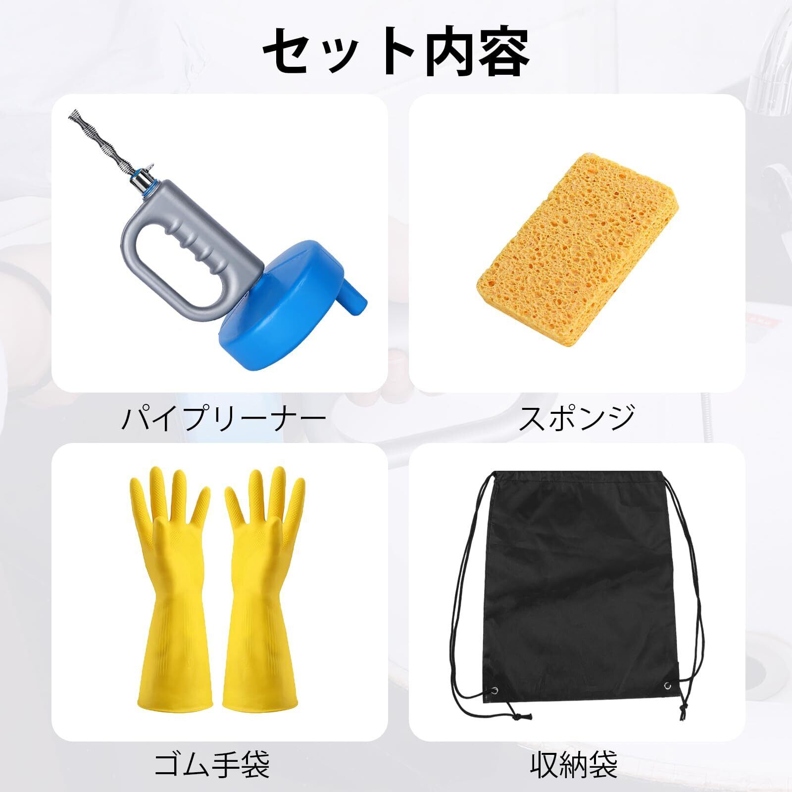 【機能性抜群&コンパクトで清潔に保管】排水口つまりワイヤーには手袋、スポンジ、収納袋が付属しているので、手を綺麗に保てるだけでなく、パイプクリーナーワイヤーをきちんと収納できます。