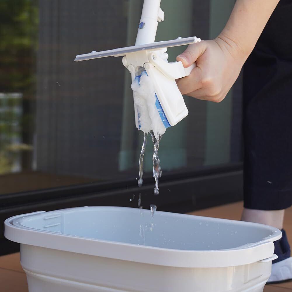【手を汚さずお掃除】拭き幅は約18cm。他の窓用ワイパーに比べて小さ目ですが、その分フィット性がいいので均一にお掃除できます。また、通常の丸型バケツに入るサイズなので、モップの洗浄も簡単にできます。 絞りレバーを引き下げるだけでモップのスミまで手を汚さず一気に絞れます。