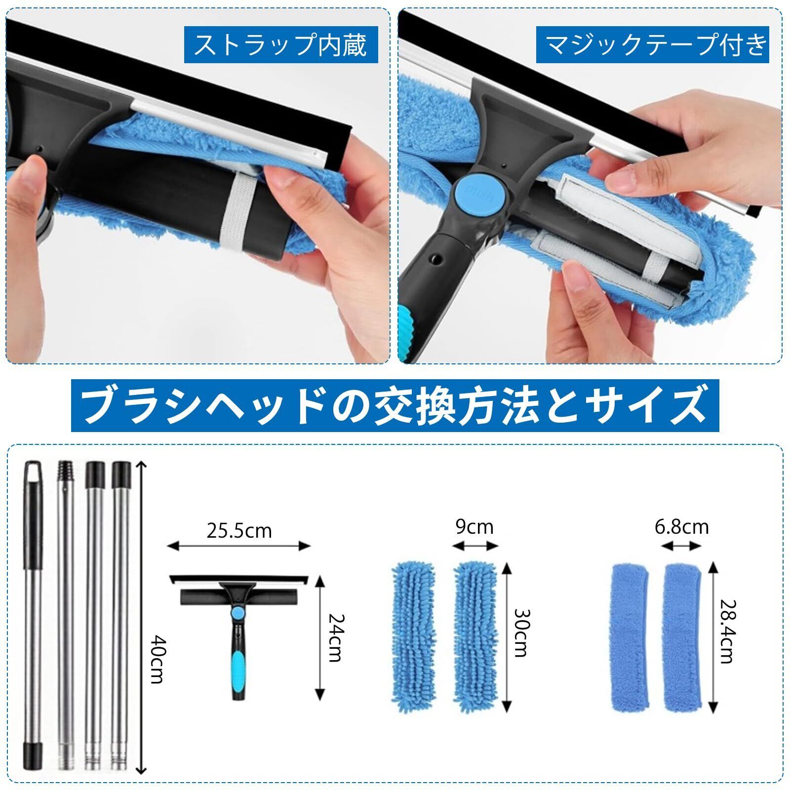 取り外し可能な窓掃除道具:この窓掃除ブラシには2つの超吸水性の交換用クリーニングブラシが付属しており、取り付けが簡単で、使わない時、分解しても収納も簡単です。簡単に取り外して洗濯機で洗うことができます