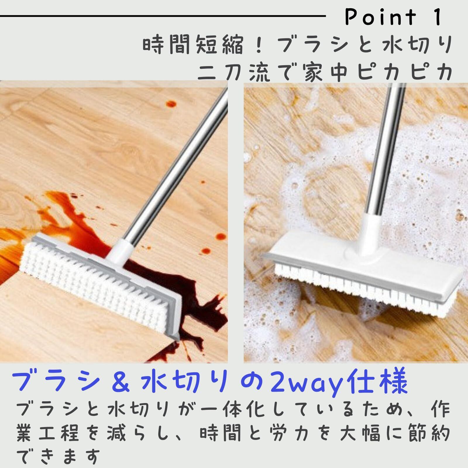 【ブラシ&水切りの2way仕様】デッキブラシと水切りが一体化した掃除用品です。ブラシで汚れを落とした後、すぐにワイパーで水切りができるので、作業効率が大幅に向上します。二つの道具を持ち替える手間が省けます。1本で様々な箇所の掃除や仕上げができます。ワイパーは水切れが良く、床面を素早く乾燥させます。カビや水垢の発生を抑制します。
