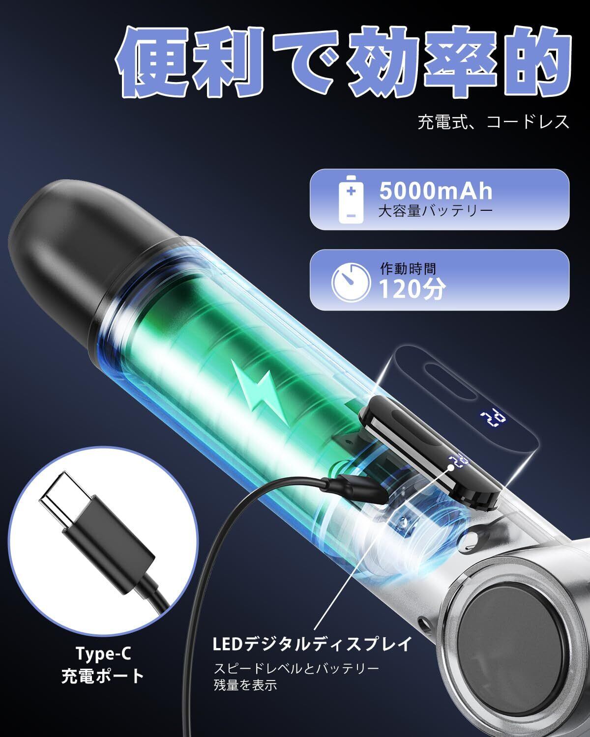 【USB充電-コードレス設計】電動お掃除ブラシにはUSB Type C急速充電技術搭載の大容量5000mAhバッテリーが内蔵されており、1回の充電で最大120分間効率よく作業できるので、バッテリー交換の必要がありません。また、現在のバッテリー残量は本体のディスプレイで確認できる。コードレス設計の電動お掃除ブラシは、電源コードに気を取られることなく、動き回りながら手の届きにくい場所を掃除することができます。