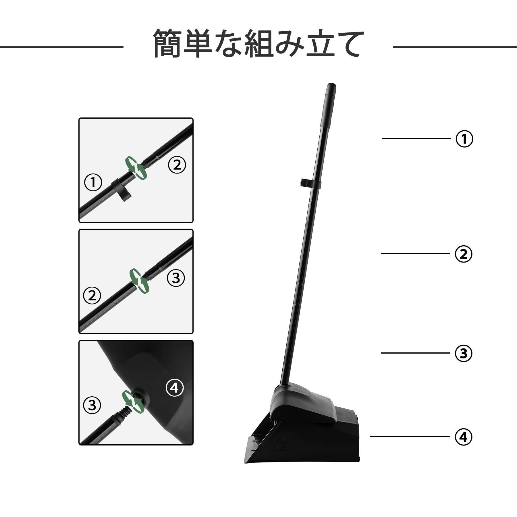 【ちりとり蓋の開閉やハンドルの自立】説明写真参考の上:(1)”ガチン”と聞えるまで、片手でちりとりのハンドルを前向きにと押すと、ちりとりの蓋が本体から外して、ちりとりの蓋が開閉できます。(2)片手でちりとりのハンドルを後ろ向きに移すと、ちりとりの蓋が本体に固定されます。ちりとりのハンドルが倒れずに、自立できます。