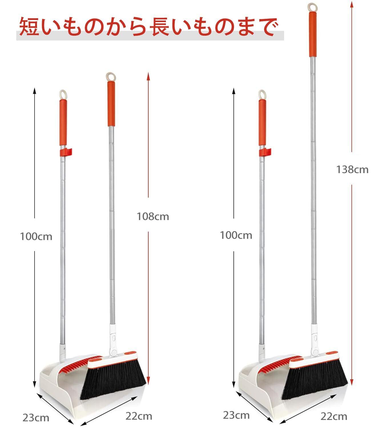 138cmのロングハンドル: JEHONN 138cmのロングハンドルほうき 室内と100cmのちりとりは、腰をかがめず、まっすぐ立って楽に掃除ができます。エクステンションポールが付属しているので、ハンドルの長さをフレキシブルに調整でき、高い場所にも届きます。