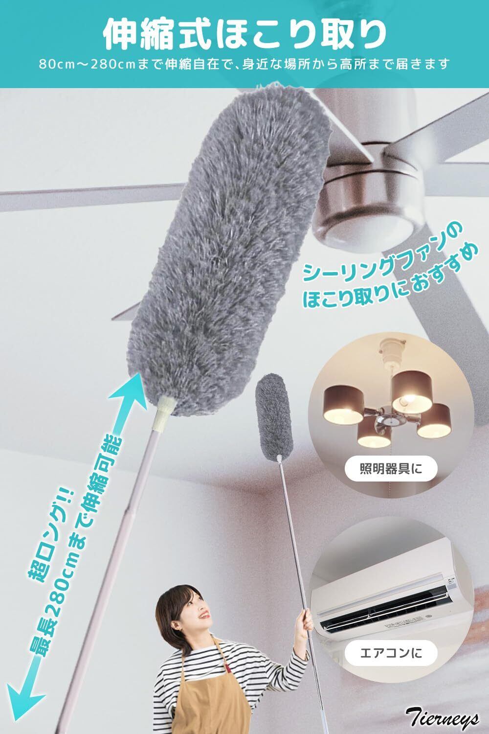 「Tierneys ほこり取り」は、最長280cmに伸縮可能なデザインで、高い場所の埃も簡単に除去できます。手が届かない場所でも、これ一本でしっかりと清掃できる便利アイテムです。