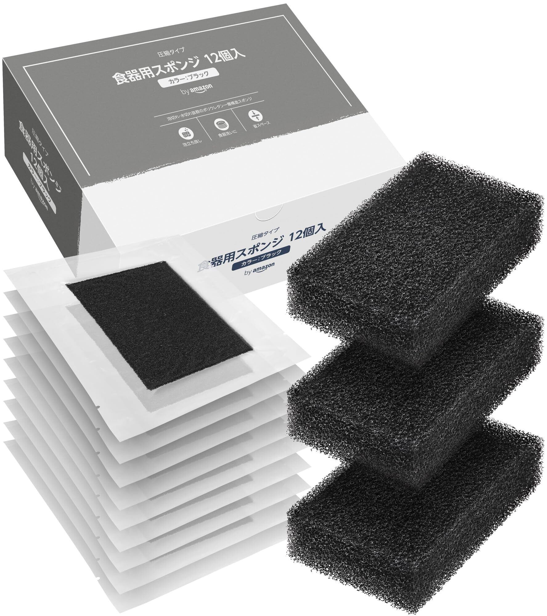 by 圧縮タイプ 食器用スポンジ 圧縮前サイズ/約120×70×30(mm) ブラック 12個入 泡立ちバツグン 一層構造