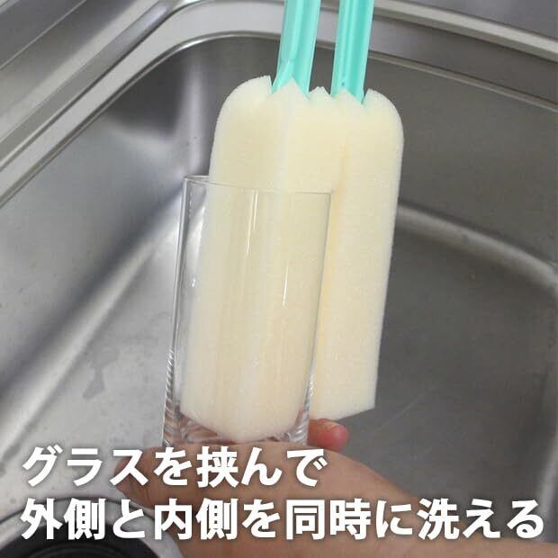 柄が付いたキッチン用のスポンジです。長いサイズなので、底まで手の入らない丈の長いコップを洗うのに最適です。スポンジにコップをはさんで回しながら使えば、両面を一度に洗うことができます。