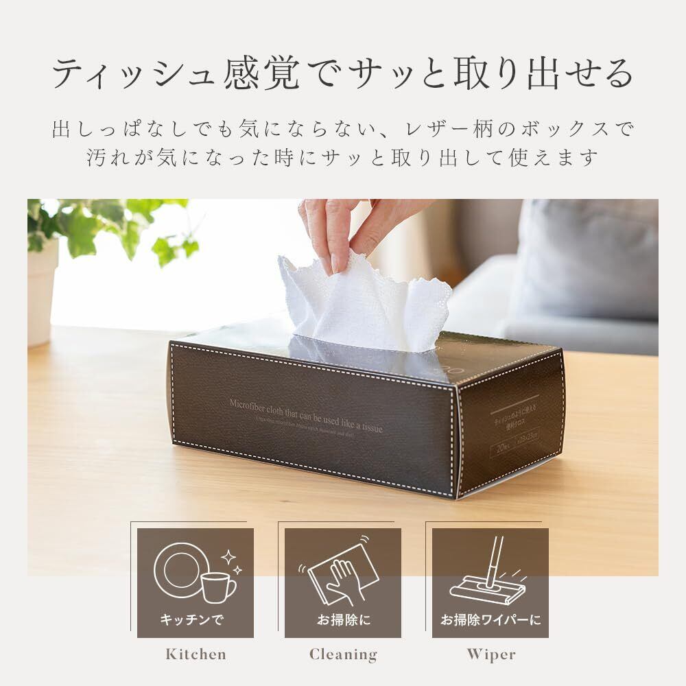 【ティッシュ感覚でサッと取り出せる】出しっぱなしでも気にならない、レザー柄のボックスで汚れが気になった時にサッと取り出して使えます!たっぷり使える20枚入り。用途や場所を選ばず使えるマルチクロスなので、キッチンや洗面所などのお掃除、お掃除ワイパーにもお使いいただけます。