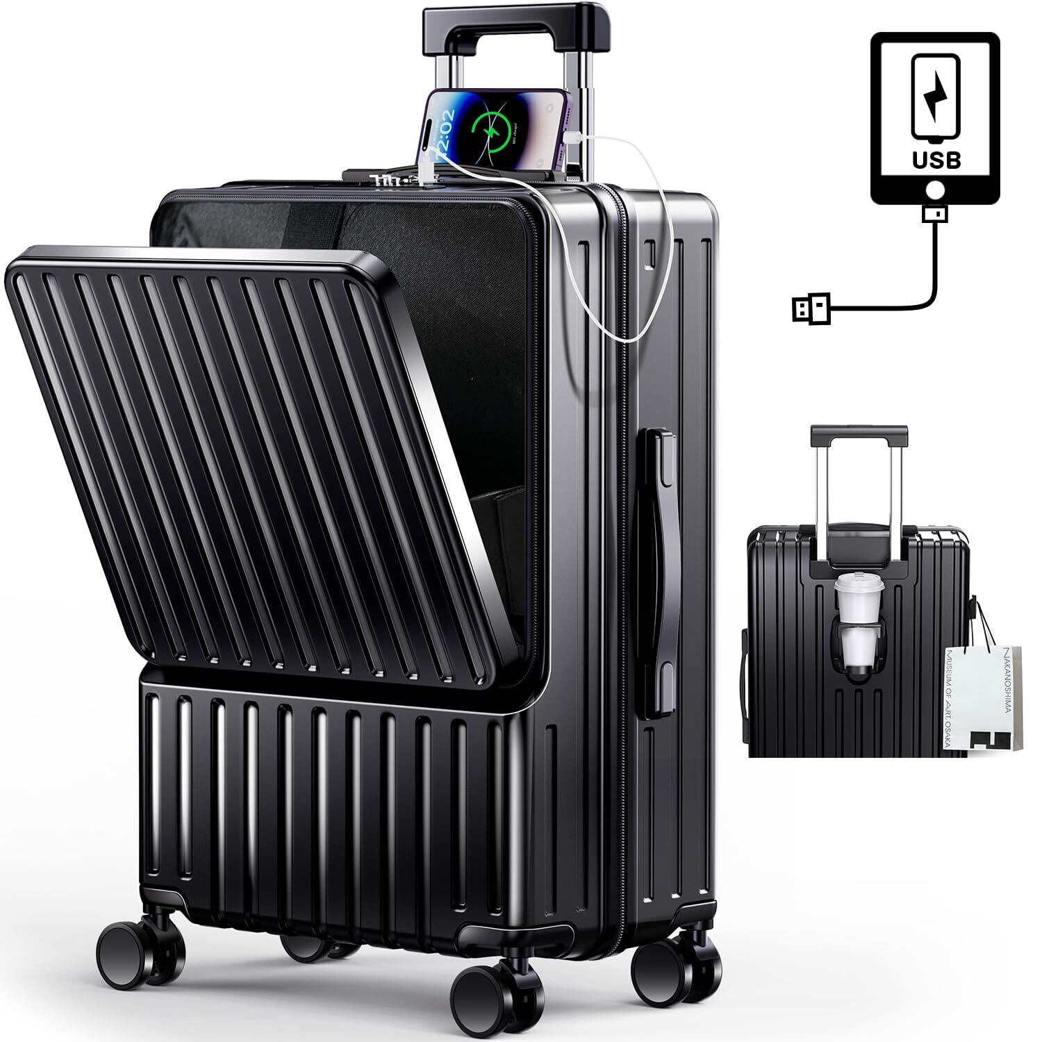 [BARGOHOY] スーツケース フロントオープン 多機能 キャリーケース 軽量 カップホルダー付き 隠しフック機能 キャリーバッグ USBポート付き 耐衝撃 静音 360度回転 TSAローク ファスナータイプ キャリーバッグ 人気 おしゃれ 旅行 ビジネス 出張 修学 泊まる 入院 (ブラック, Sサイズ機内持込OK /42L(1~3泊))