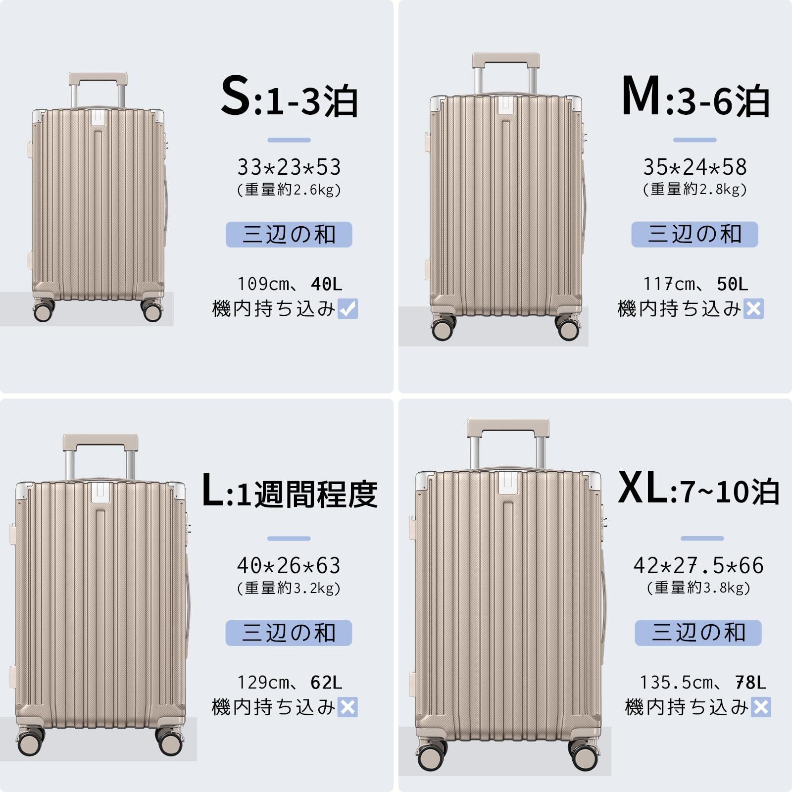 【サイズ】Sサイズ(機内持ち込みOK): 33×23×53cm(重量約2.6kg)、容量約40L(1~3泊対応);Mサイズ:35×24×58cm(重量約2.8kg)、容量約50L(3~6泊対応);Lサイズ:40×26×63cm(重量約3.2kg)、容量約62L(1週間程度);XLサイズ:42×27.5×66cm(重量約3.8kg)、容量約78L(7~10泊対応)※サイズ測定には多少の誤差がありご了承ください。