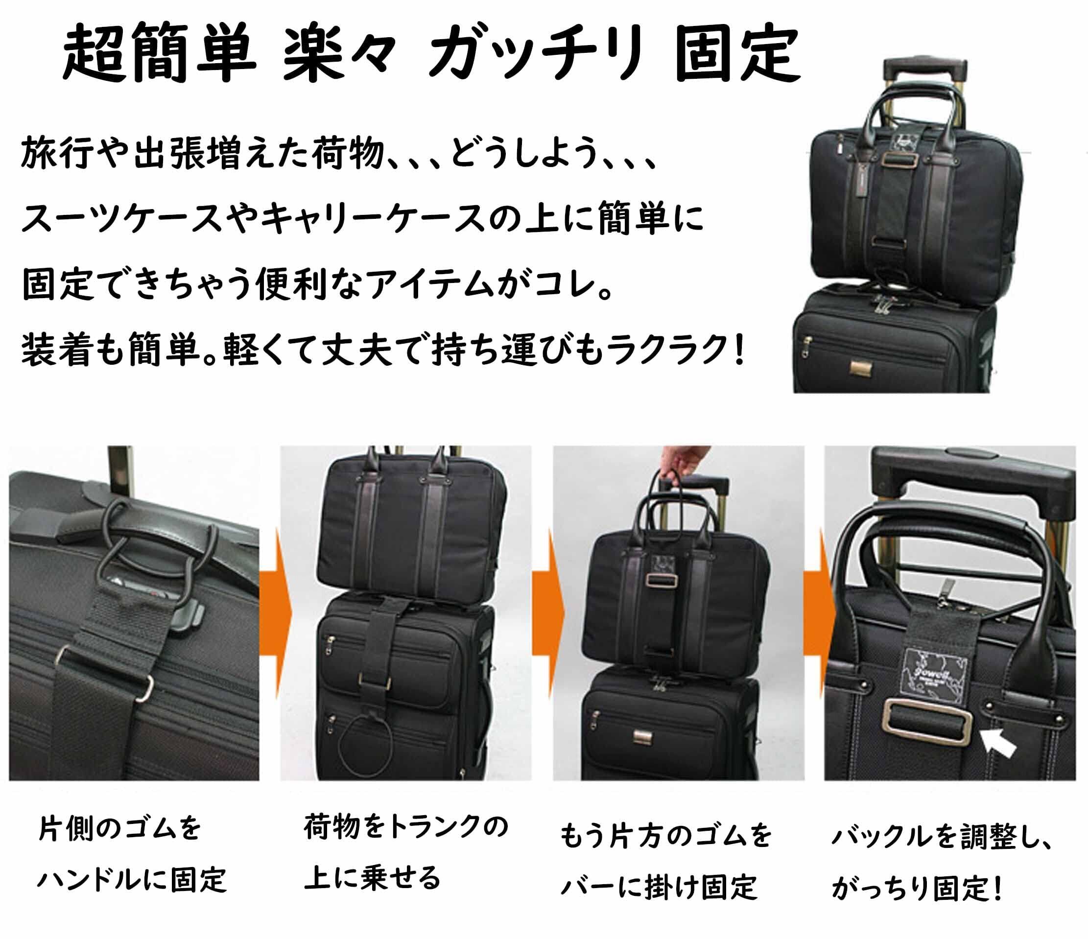 ●特徴・・・スーツケースの上に手荷物をがっちりホールドできる機能ベルト。長さ調節もスムーズに行えます。キャリーの上に荷物を載せてもズレ落ちない 便利 旅行グッズ トラベルグッズ です。