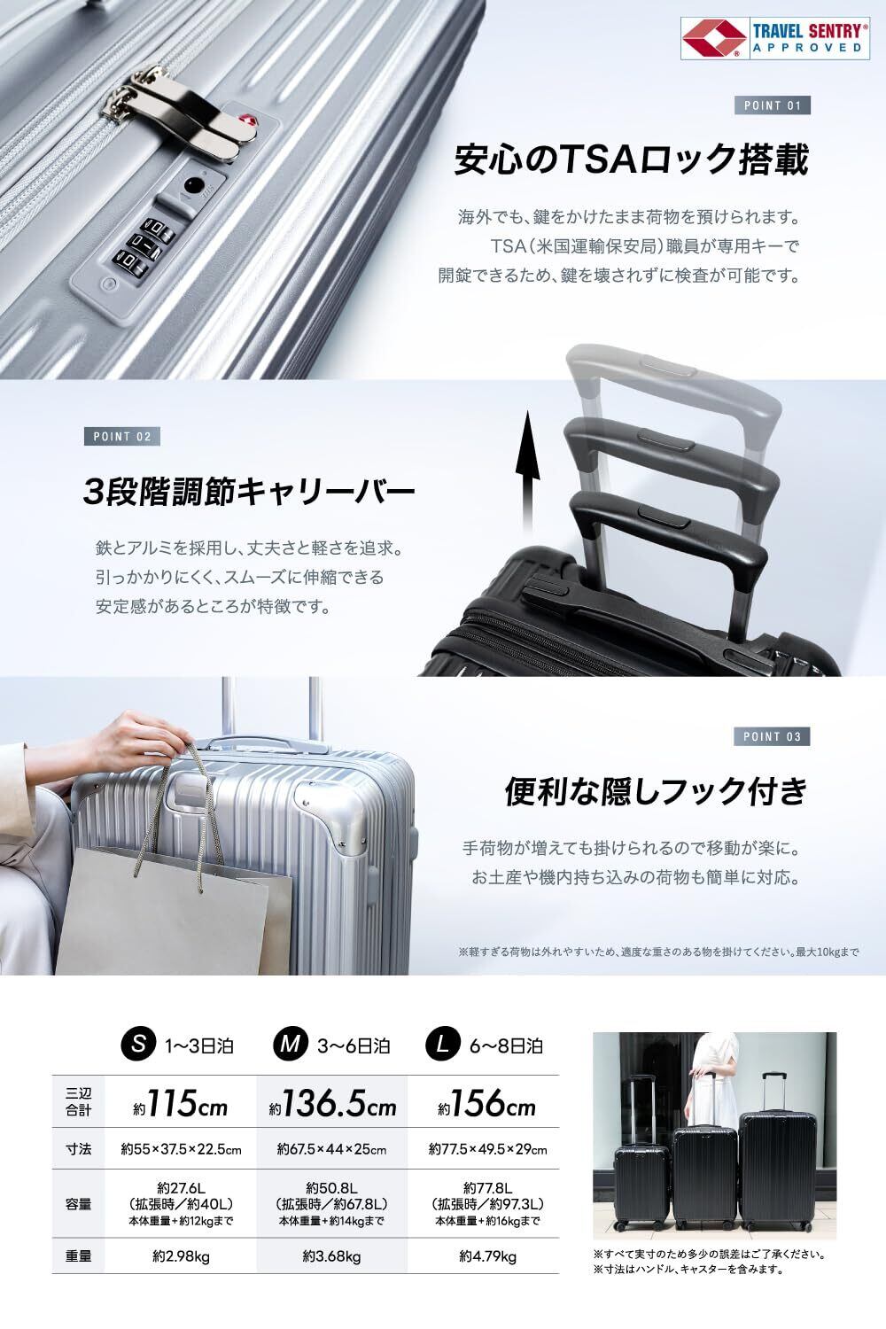 【 現役客室乗務員 × 日本企業 】現役客室乗務員の経験を生かし細部までこだわった機能性。使いやすさと軽量で丈夫なところがポイントです。また、国内品質検査にて厳しい試験も実施済みなので安心してお使いいただけます。 旅行やビジネスなど様々なシーンでお使いいただけるデザインのキャリーケース。 【機内持ち込み可能/超軽量】機内持ち込み可能なサイズは、キャスター・ハンドルを含む3辺の合計が115cm以内です。※100席未満の飛行機やLCCの場合は規定サイズが異なるため、各航空会社にご確認ください。 本製品のSサイズは【高さ:約55cm 横:37.5cm 厚み:22.5cm(キャスター・ハンドルを含む)】です。 (Sサイズ容量)約27.6L →(拡張後)約40L(重量)約 2.98kg