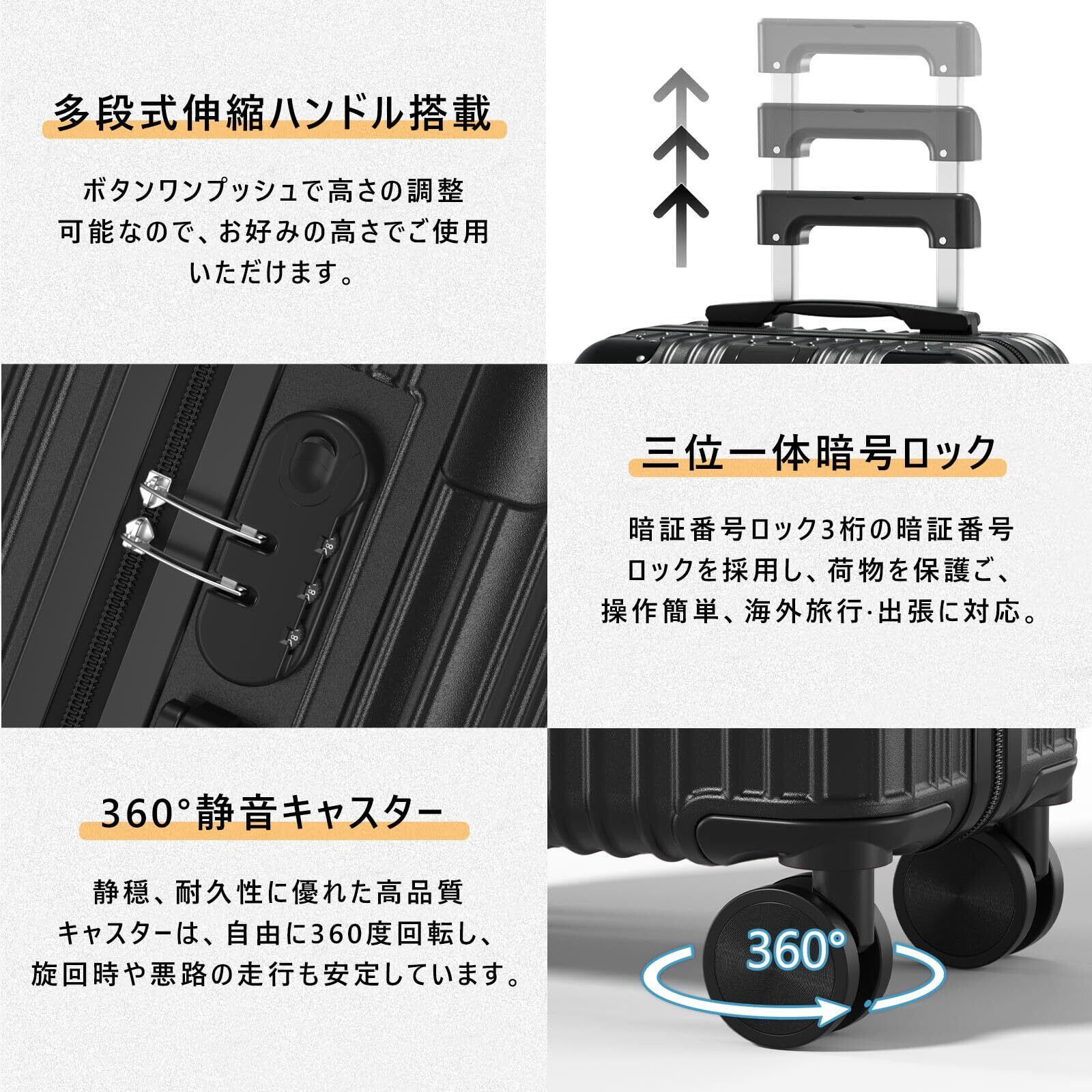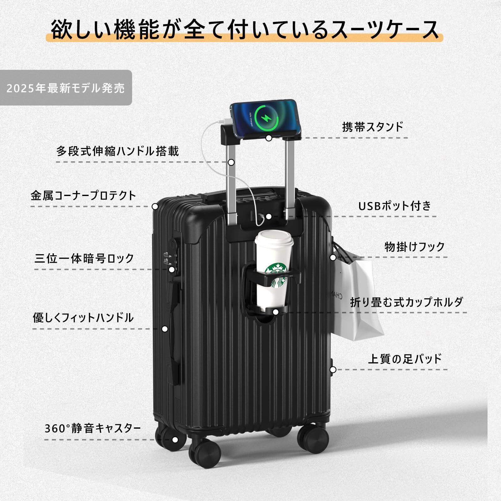 \【◆[SupTrip] スーツケース 機内持ち込み キャリーケース USBポート付き キャリーバッグ カップホルダー付き 隠しフック機能 多機能 大型 超軽量 静音 ダブルキャスター 耐衝撃 360度回転 軽量 ビジネス 修学 泊まる 旅行 出張 (ブラック, Sサイズ/機内持込(1-3泊))!】/