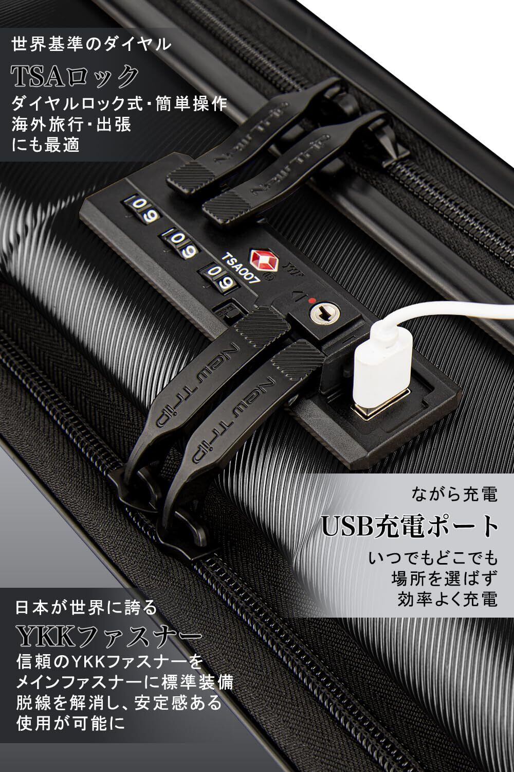 [New Trip] スーツケース 機内持ち込み フロントオープン キャリーケース Sサイズ USBポート付き ストッパー付き YKKファスナー TSAロック 静音 ダブルキャスター ビジネス 出張 1-3泊 40リットル ブラック