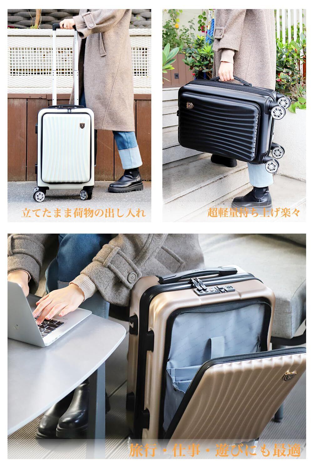 フロントオープン式のデザインで、荷物の出し入れがスムーズに行えます。これにより、空港での待ち時間もストレスフリー!すぐに取り出したいアイテムを簡単にアクセスできます。