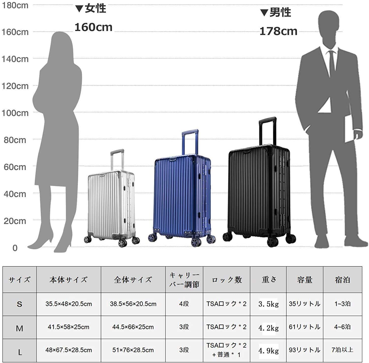 【サイズ】トランクケースのSサイズ: 外寸20インチ:約縦56×横38×奥行20cm(キャスター、取っ手含む)Sサイズはスーツケース 機内持ち込みサイズ、1~3泊に似合います。一部の航空会社だけに適用します、100席以上の国内線持ち込み可能で、事前に航空会社に確認したほうがいいんです。 外寸 Mサイズ:24インチ:約縦67.5×横45×奥行25.5cm(キャスター、取っ手含む)4~6泊に似合います。(キャスター、取っ手含む)4~6泊に似合います。 Lサイズ: 約縦74×横48×奥行27cm(キャスター、取っ手含む)7泊以上に似合います。
