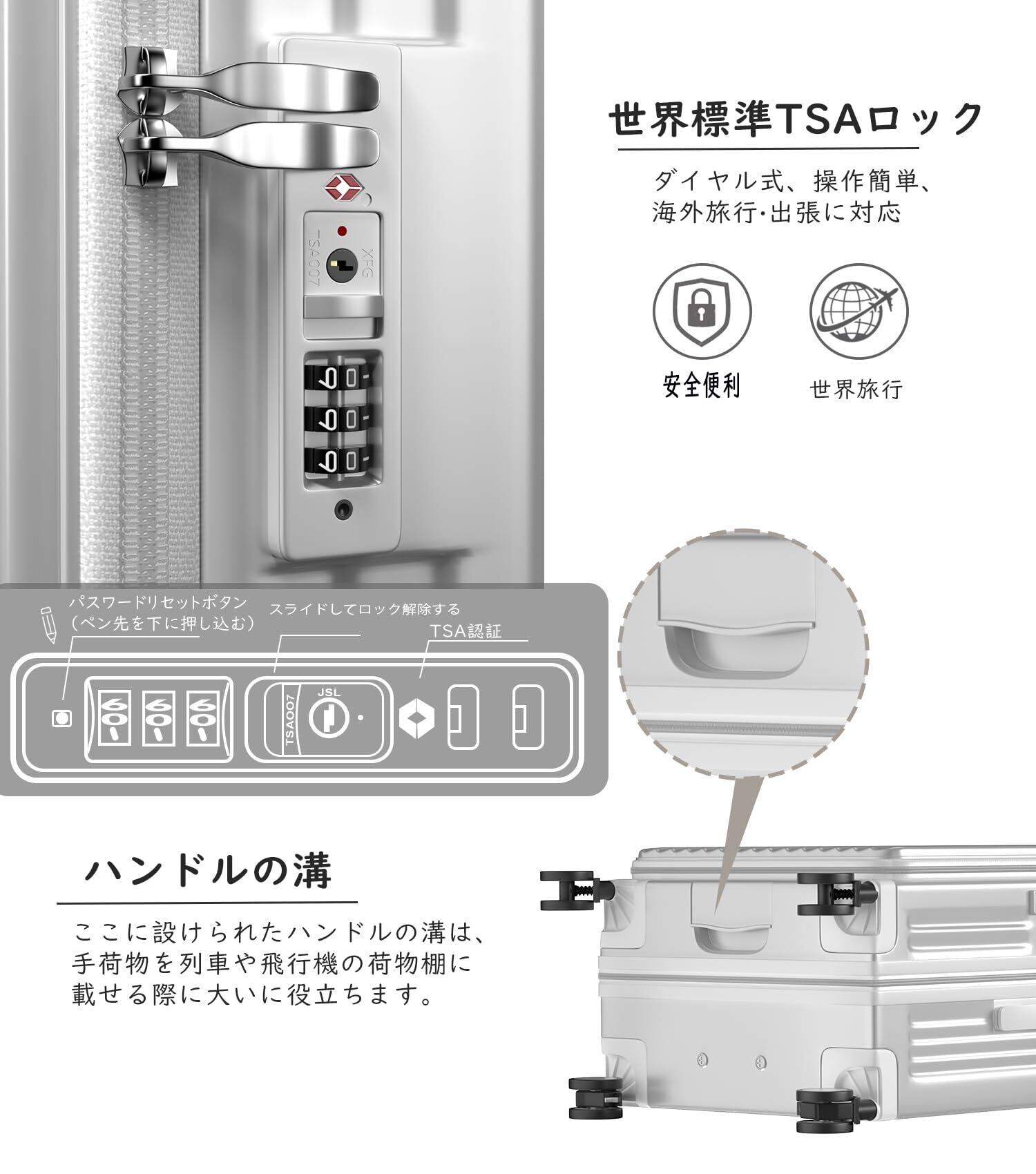 【三段調節キャリバー・世界基準の安全性】超軽量のアルミニウム製キャリバー、高さ三段階調節、ご自分の身長に合わせてスムーズに調整が可能です。耐振性に優れるデザインで荷物を引きかける時、しっかりしています。また、滑りにくいソフトハンドルで長い時間の手提げでも手は疲れません。海外旅行には欠かせないTSAダイヤル方式のロックが搭載されており、外出がより安全になります。※鍵は航空会社検査専用のため本製品には付属しておりません。