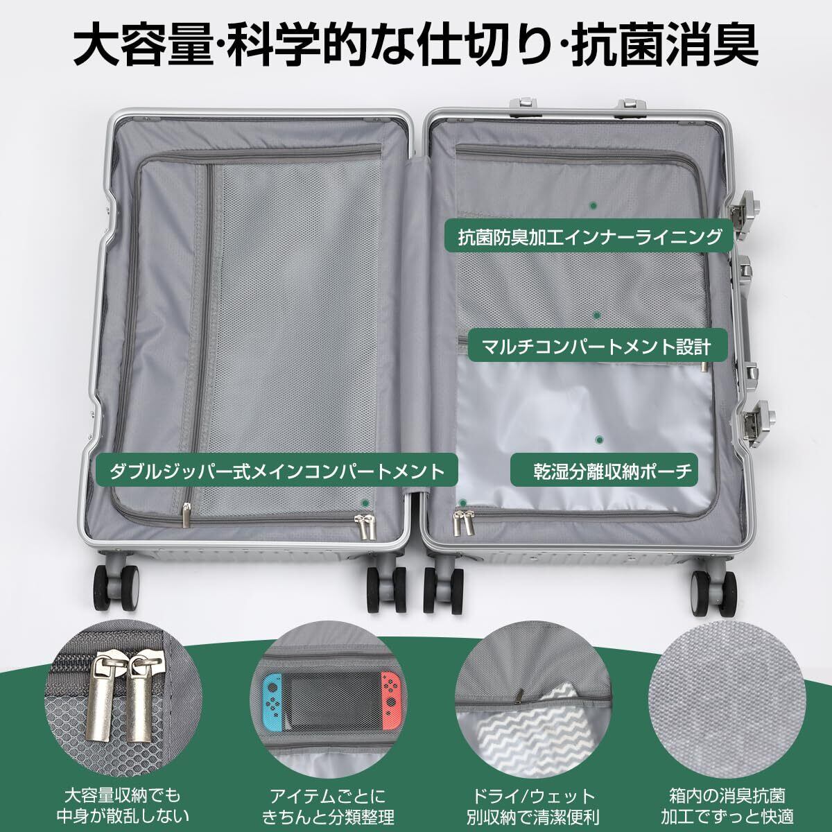 【大容量&収納システム&抗菌防臭設計】 こちらのMサイズスーツケース(66×43×25cm)は、革新的な収納システムを採用し、大容量と整理整頓を両立。2つのメインコンパートメントには両開きの防爆ファスナーを装備し、5~7着の衣類をきれいに収納しながら、中身の散乱を防止。2つの透明メッシュポケットでパスポートや充電器などの小物を分類収納可能。防水のウェット&ドライポケットは、水着や濡れたタオルなどを清潔な衣類と完全に分離し