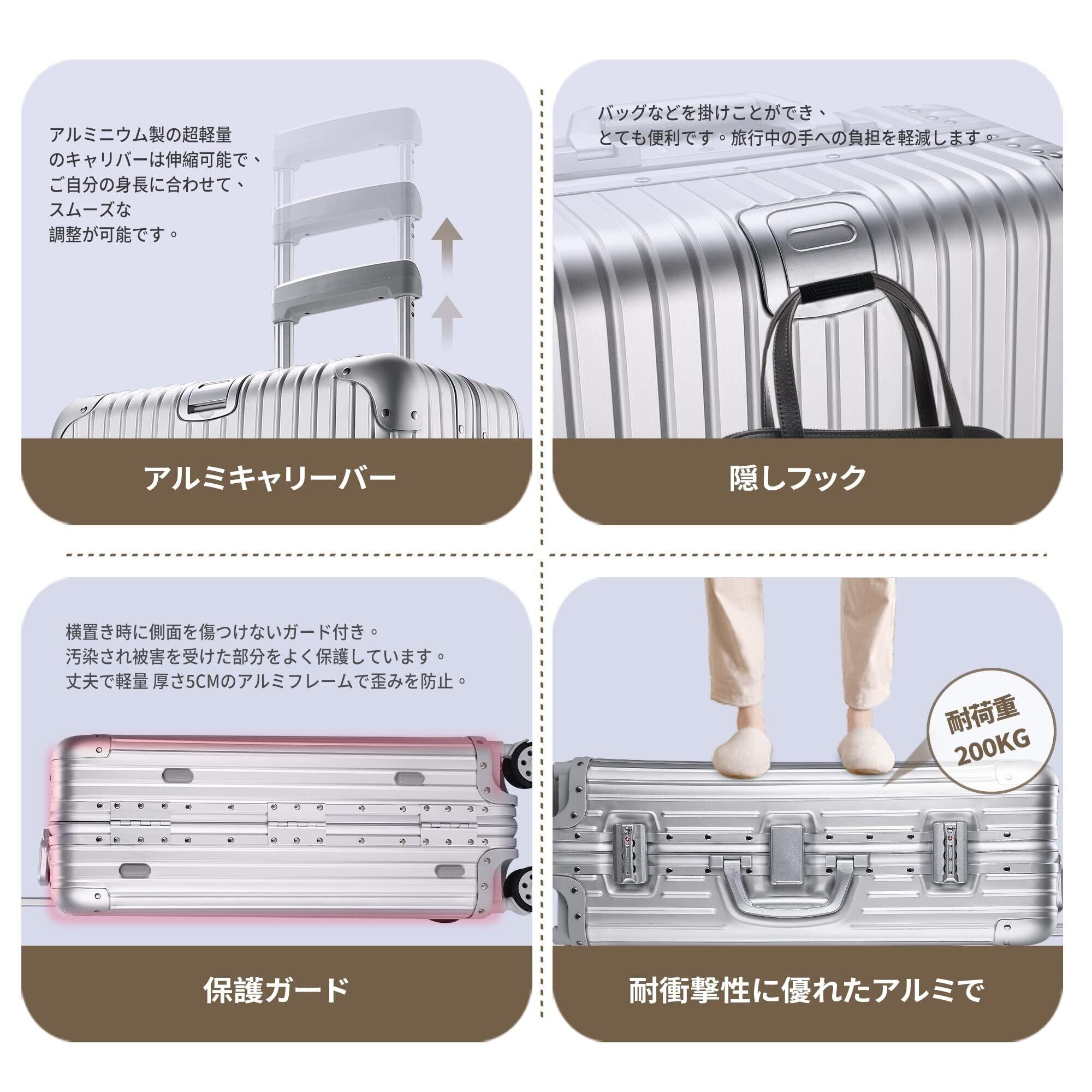 【全アルミニウム合金ボディ+アルミニウムフレーム】このアルミ製スーツケースは、 全アルミニウム合金ボディとアルミニウムフレームを備えており、洗練されたクールな外観を持っています。金属素材により強度と耐久性が確保され、長寿命を実現しています。金属のボディが高級感を演出し、優れた選択肢となります。有名ブランドの製品と比較すると、数倍もの価格差がありながら、丈夫で軽量であるという点で優れています。ご注意ください:TSAロックには2種類のパスワード設定方法があります。ロック解除にはメイン画像または紙の取扱説明書をご確認ください。両者には異なる点があります。