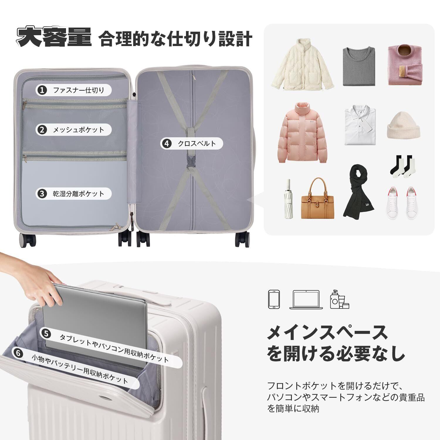 【トップオープン式】スーツケースはトップオープン式ポケットを搭載し、メイン収納を開ける必要なく、パソコンやスマートフォンなどの荷物を立てたまま簡単に取り出すことができます。特に出張の方に適しており、必要なものに素早くアクセスでき、仕事の効率を向上させます。更に物掛けフック式底足付きで手荷物を掛けて気楽に移動でき、旅行中の手への負担を軽減します。※鍵穴は航空会社検査専用の物です。本製品に鍵は付属しておりません。