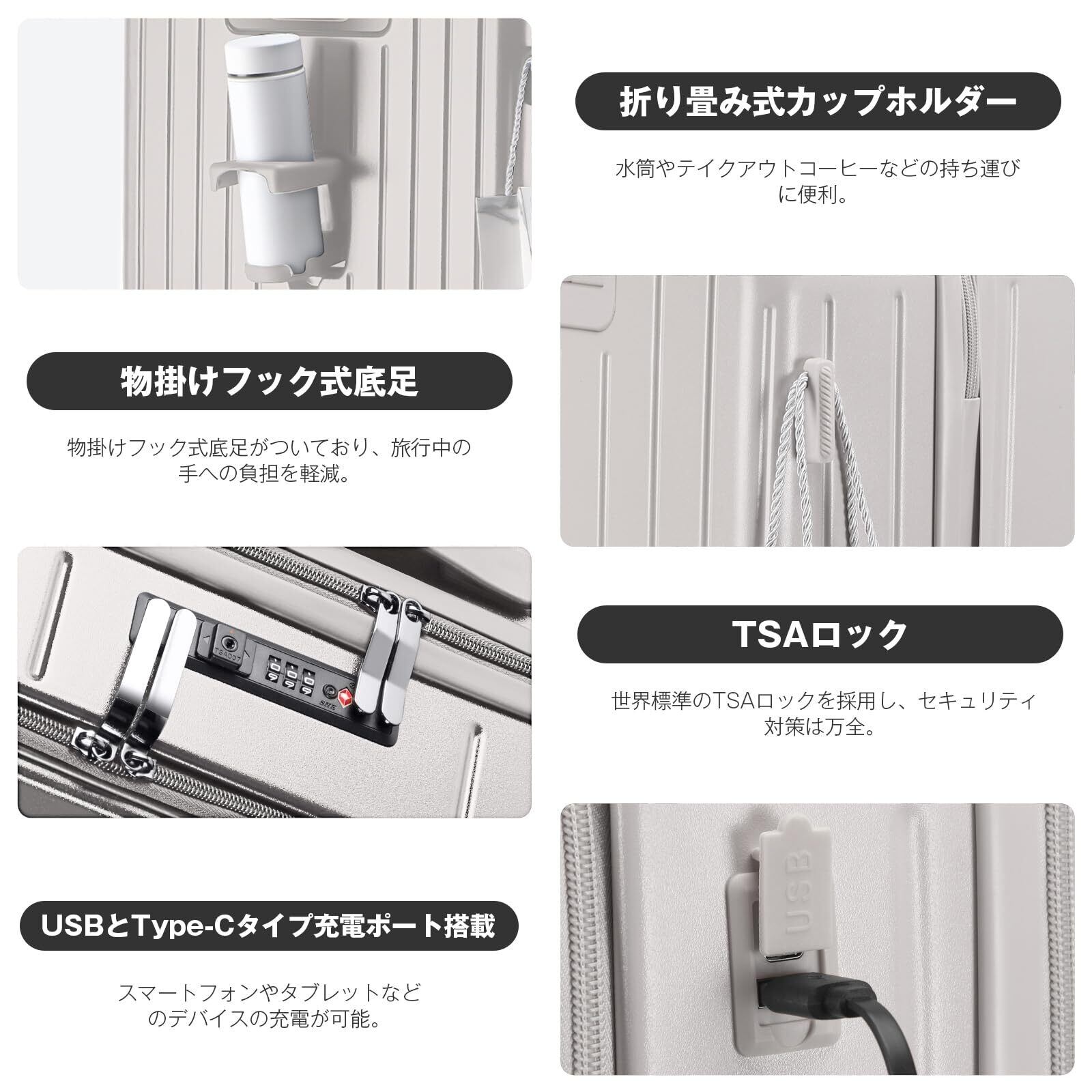【USB充電ポート&カップホルダー付き】便利なUSB充電ポート付きのスーツケースは、場所を選ばずにいつでもどこでも移動しながら、効率よく電子機器を充電できます。また、折り畳み式のカップホルダーも装備されており、水筒やコーヒーカップなどの飲料容器を持ち運びやすく、スーツケースの実用性と利便性をより一層高めています。
