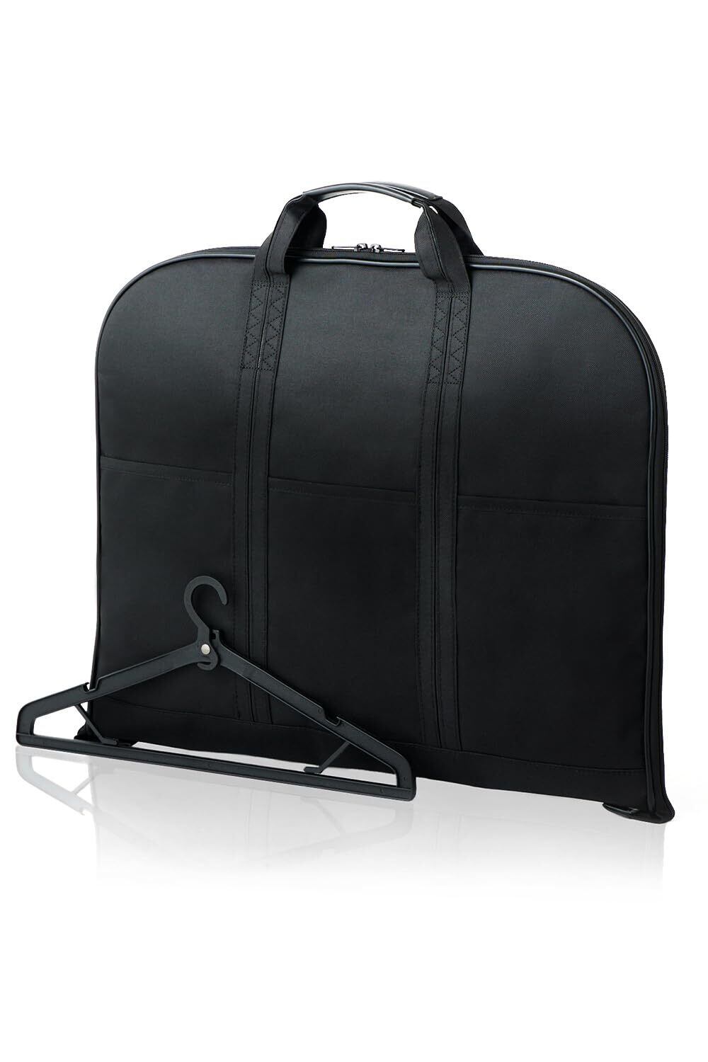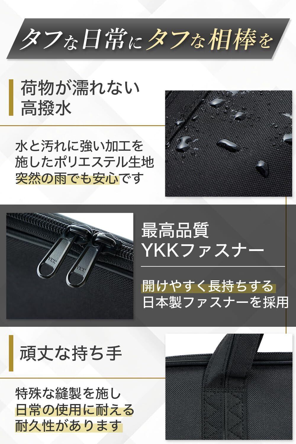 【機能的な素材が実現する保護力と耐久性】厚手のポリエステル生地が雨風から荷物を守り、型崩れしない硬さがスーツをしっかり保護します。要所に施された二重縫製と、信頼性の高いYKKファスナーを使用することで、バッグ全体の耐久度が一層向上しています。