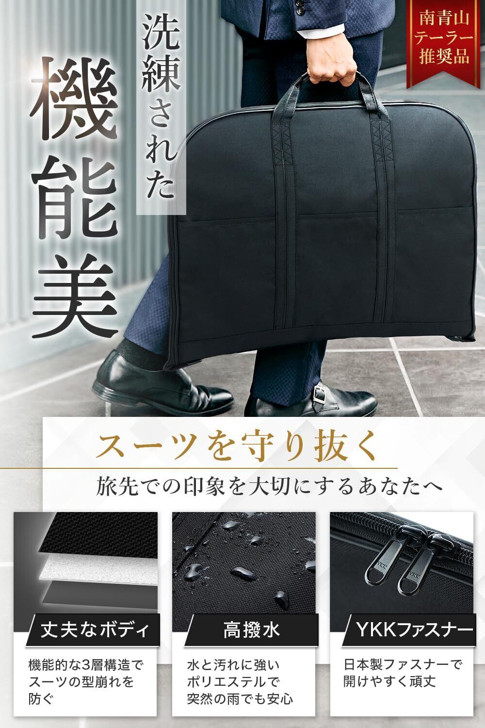 「[SUITS PARTNER] ガーメントバッグ」は、南青山のテーラーも推奨する高品質なスーツバッグです!撥水機能を備え、雨や汚れから大切なスーツをしっかりと守ります。型崩れを防ぐ設計により、移動中もスーツを美しい状態で保持し、ビジネスシーンや出張の必需品です!