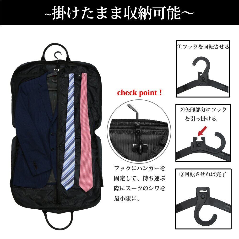 ハンガー付きのデザインにより、衣類を掛けたままの持ち運びも可能です。ビジネス、冠婚葬祭、旅行の際に最適で、特別なイベントにも安心してご利用いただけます。