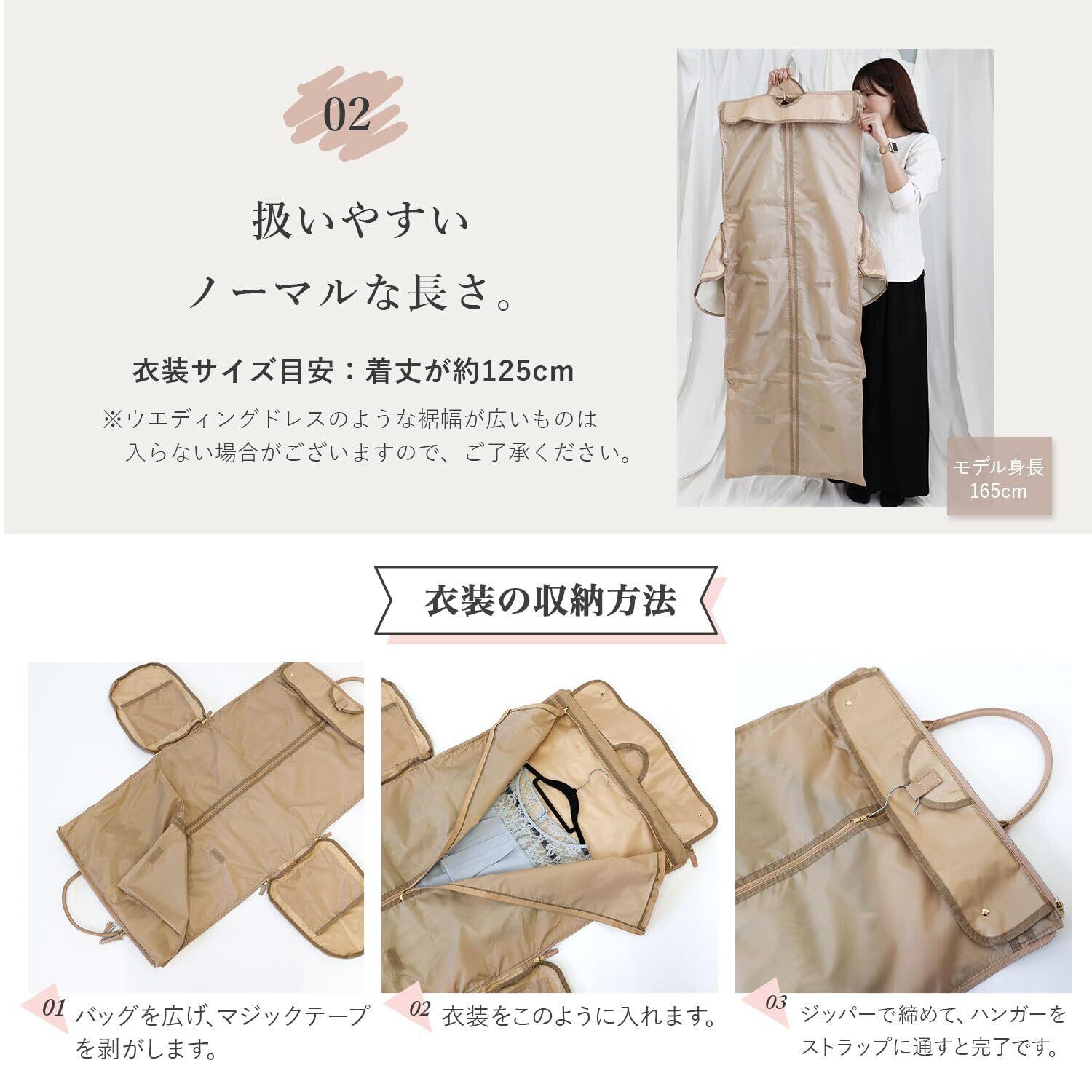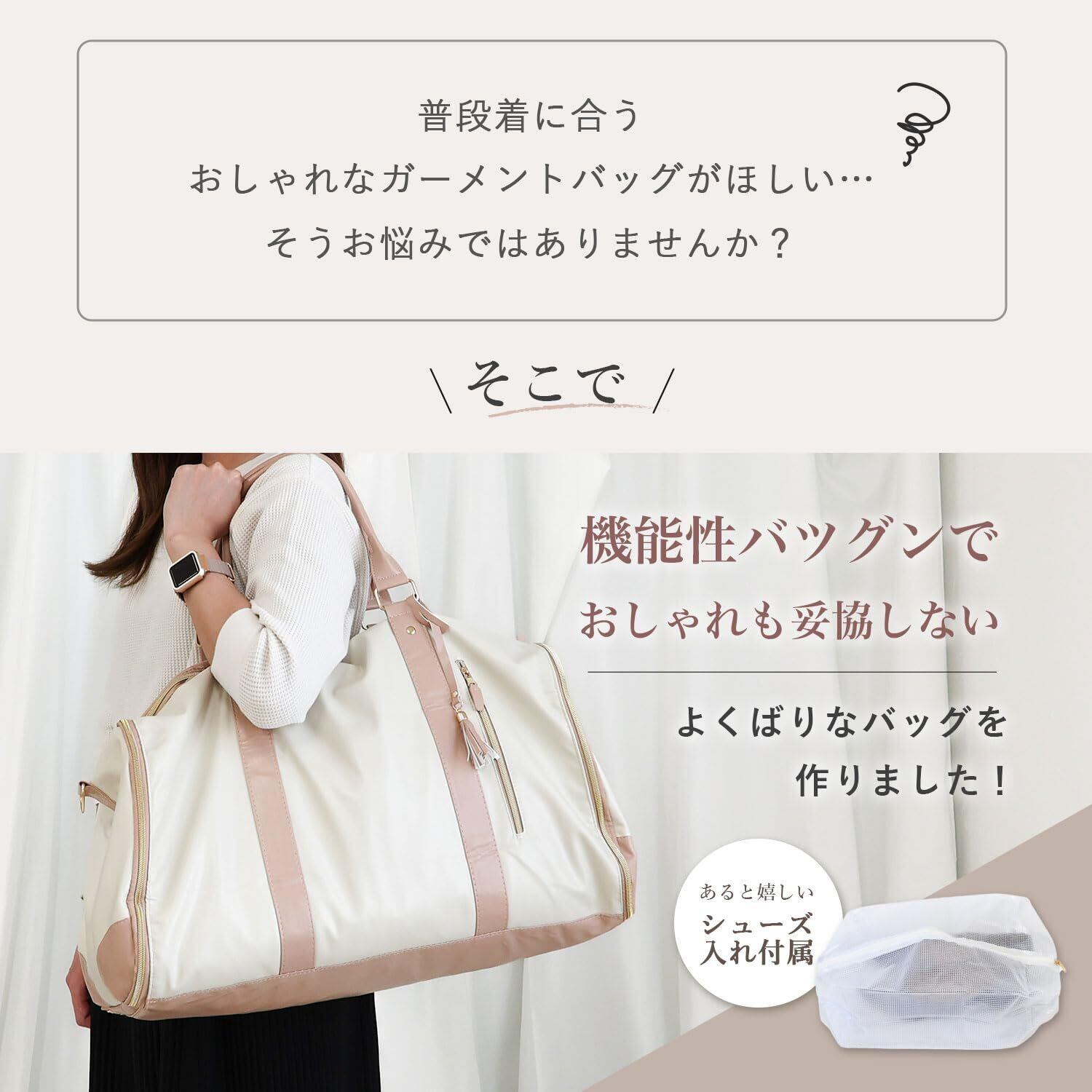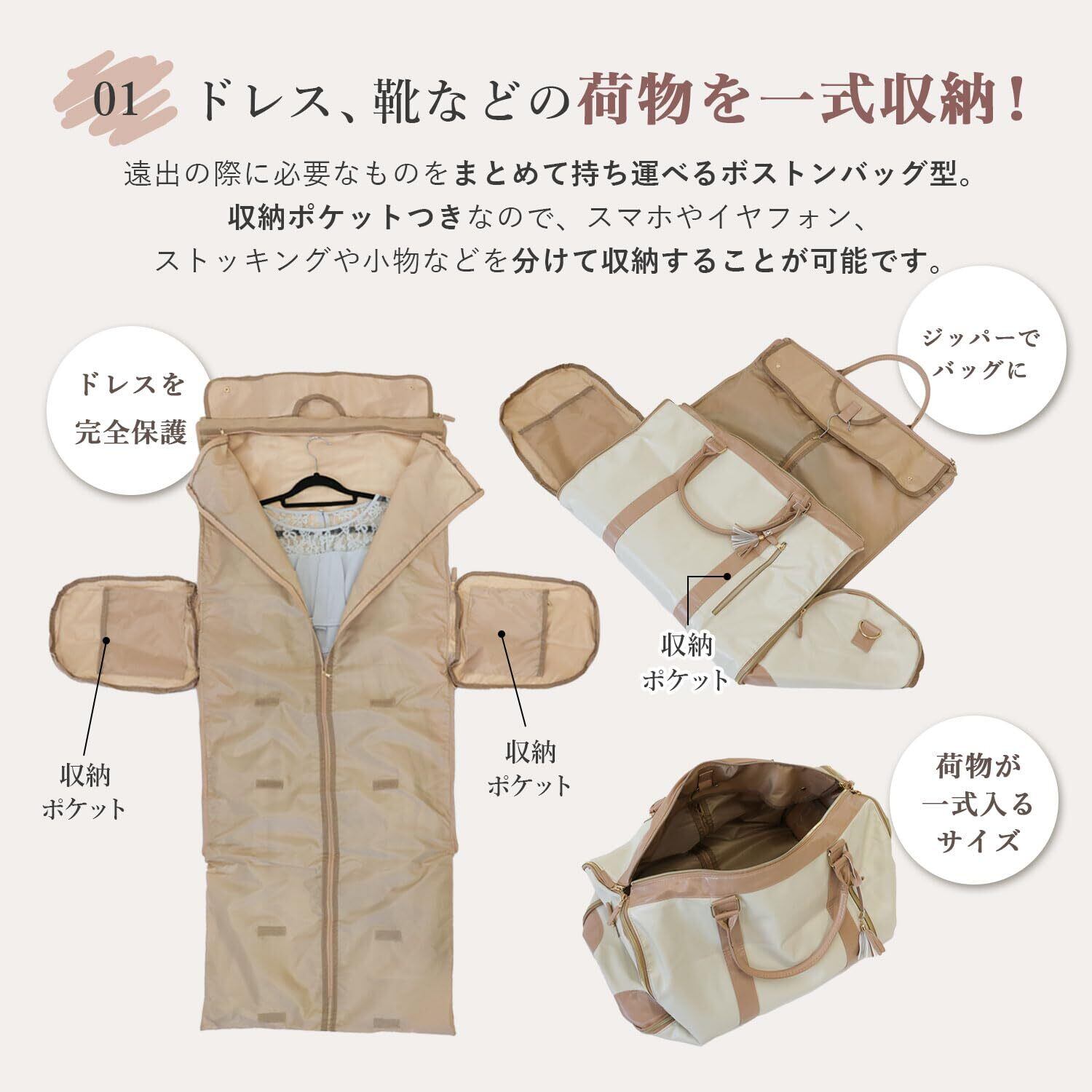 【レディース特化のガーメントバッグ】スーツや結婚式のドレス、靴など、現地で着替えが必要な際、必要なものをまとめて持ち運べるガーメントバッグです。冠婚葬祭、出張、旅行、スポーツジム、ゴルフなど、ビジネスシーンやプライベートまで幅広くお使いいただけるシンプルなカラーをチョイスしました。当店オリジナルカラーです◎