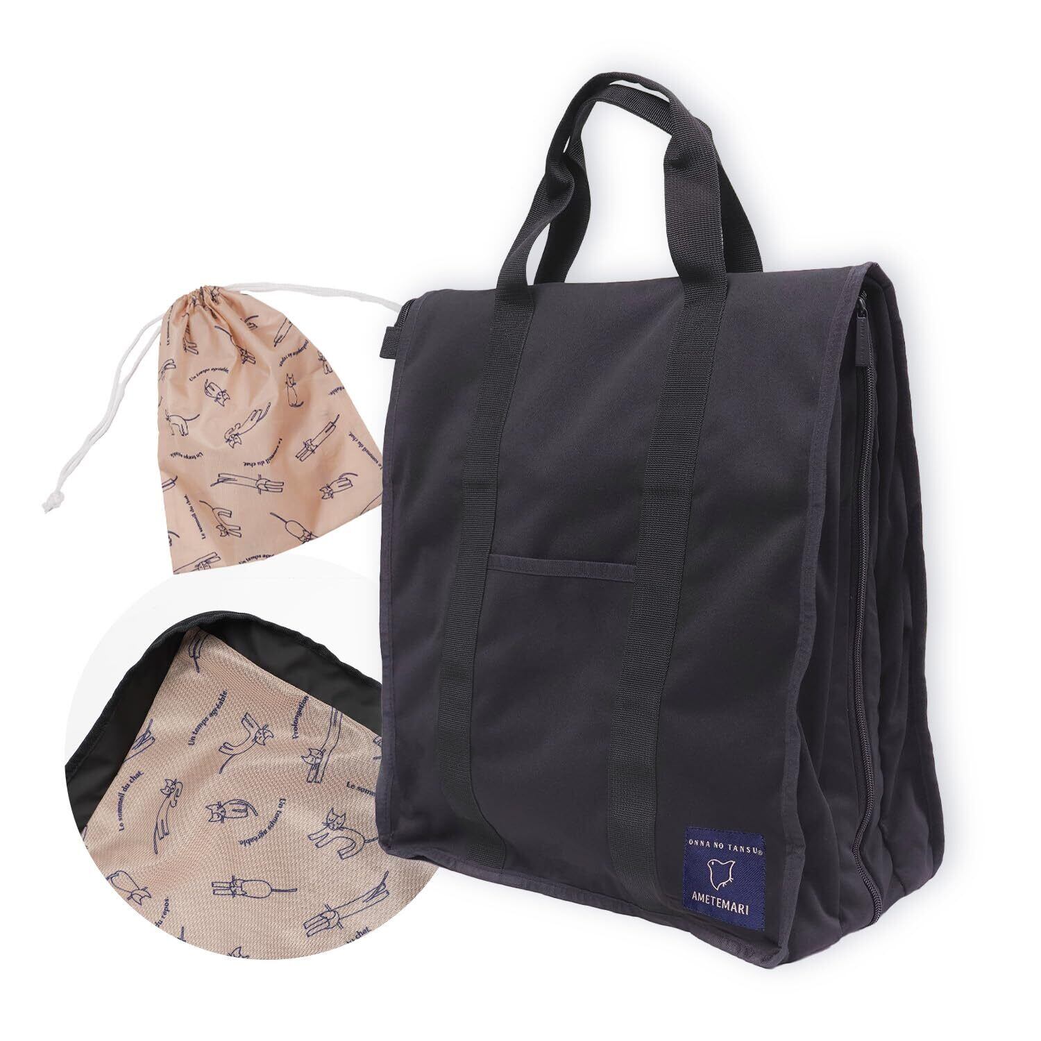 [あめてまり] ガーメントバッグ 着物バッグ 持ち運び 軽量 和装バッグ ネイビー×ベージュ 女性 人気 男女兼用 和洋兼用 スーツ コンパクト 和装一式収納 楽々 大人かわいい おしゃれ 着物 縦型 巾着ポーチ付 メッシュ生地 おんなのタンス ソフト 移動