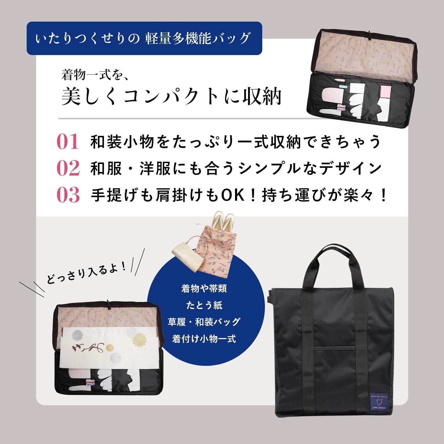 【着物一式を持ち運ぶのに最適】 和装の場合は、着物・帯・襦袢・着付け小物一式、草履やシューズも収納できます。 容量の多いお着物と小物を一緒に収納し持ち運ぶことができます。 ※和装にも洋装にもお使いいただけます。