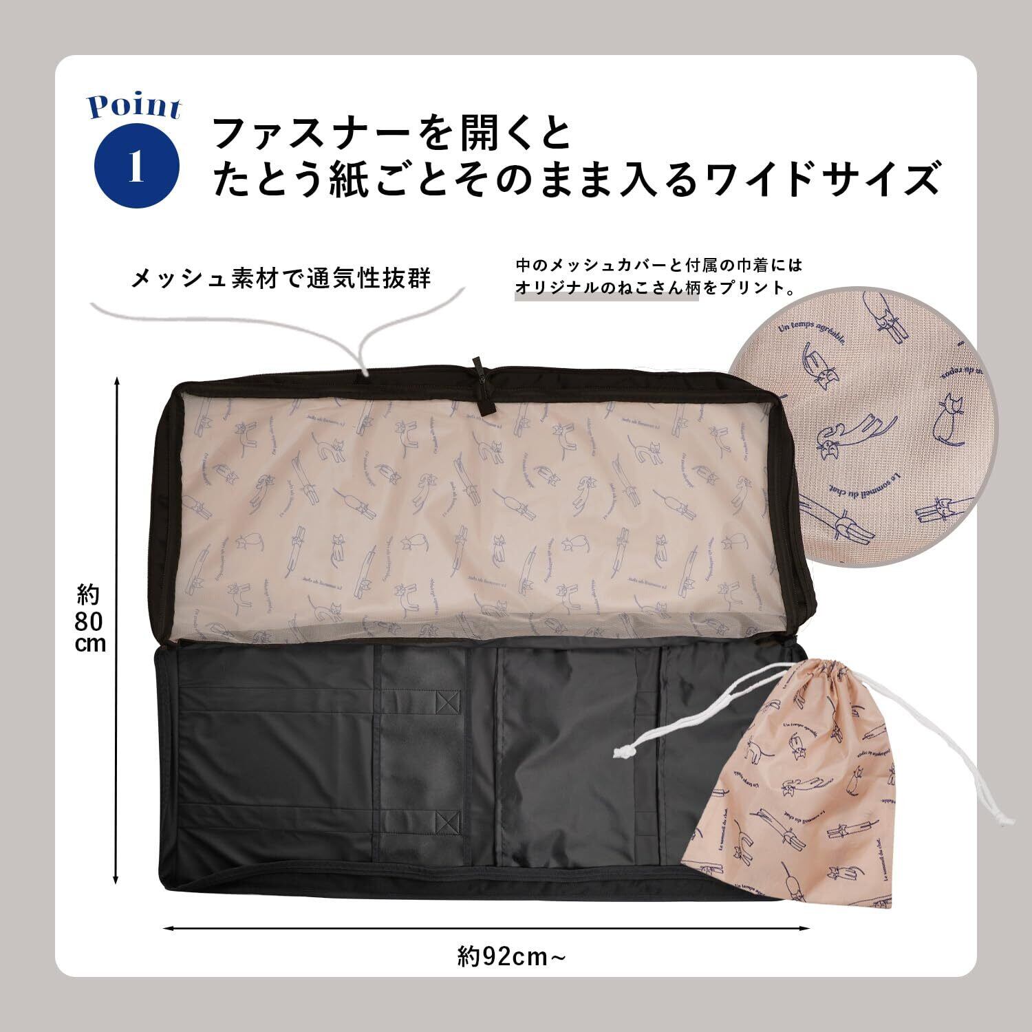 約20cmのゆったりマチで、帯板や衿芯などの長さのある小物も折ることなく収納。 ファスナーを開けバッグを開くと、着物用たとう紙もすっぽりと収まるサイズ感。 さらに収納ポケットが2つ、通気性の良いメッシュカバーが付いています。 巾着は、履物用としても小物収納用としても使えてとても便利。外ポケットには傘もイン。