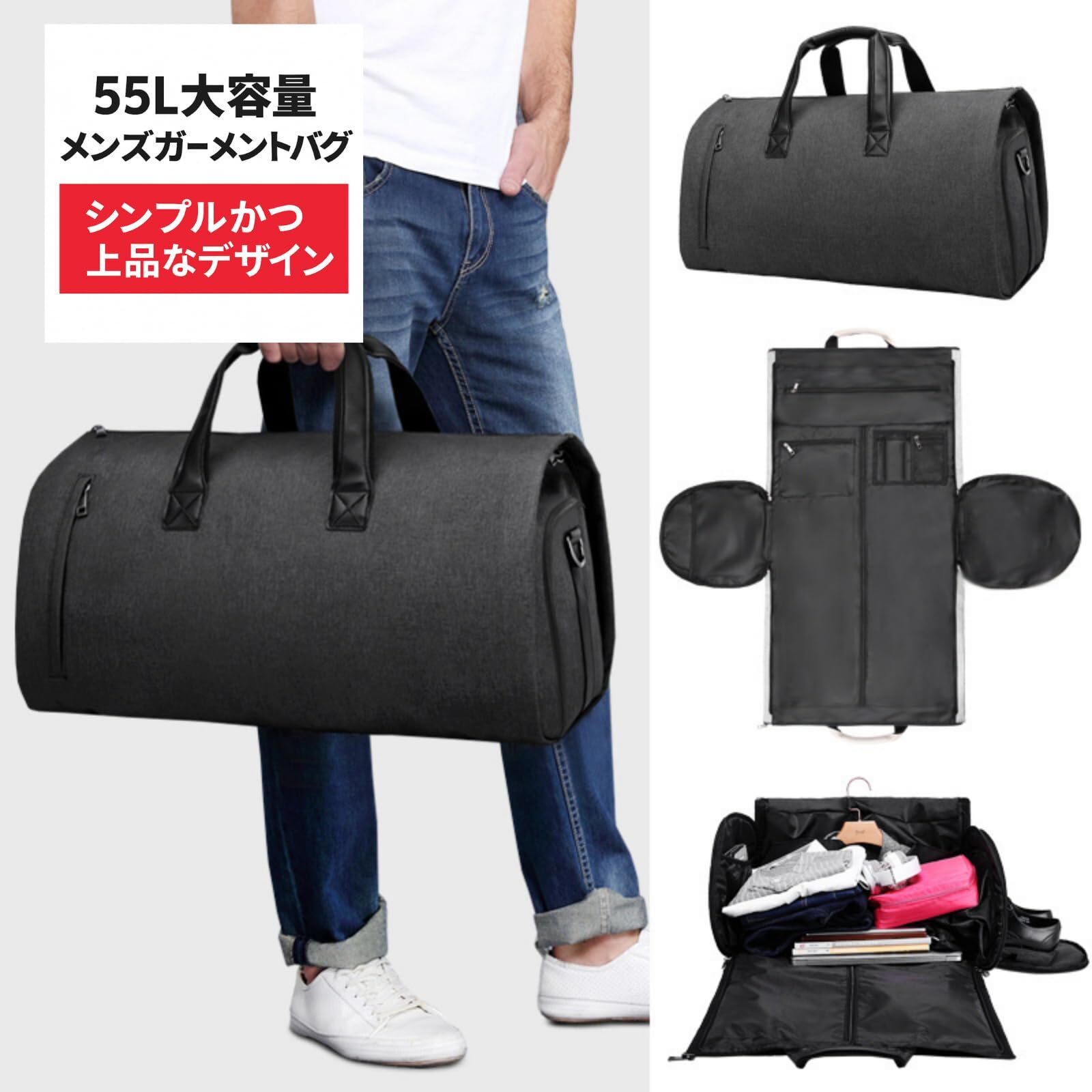 55Lの大容量を誇り、スーツやドレス、シューズなどをしっかり収納可能です!また、バッグ内部には圧縮機能があり、衣類をコンパクトにまとめられるため、スペースを有効活用できます。特に出張やスポーツの際には、全ての必要なアイテムを一つで持ち運べる便利なアイテムです。