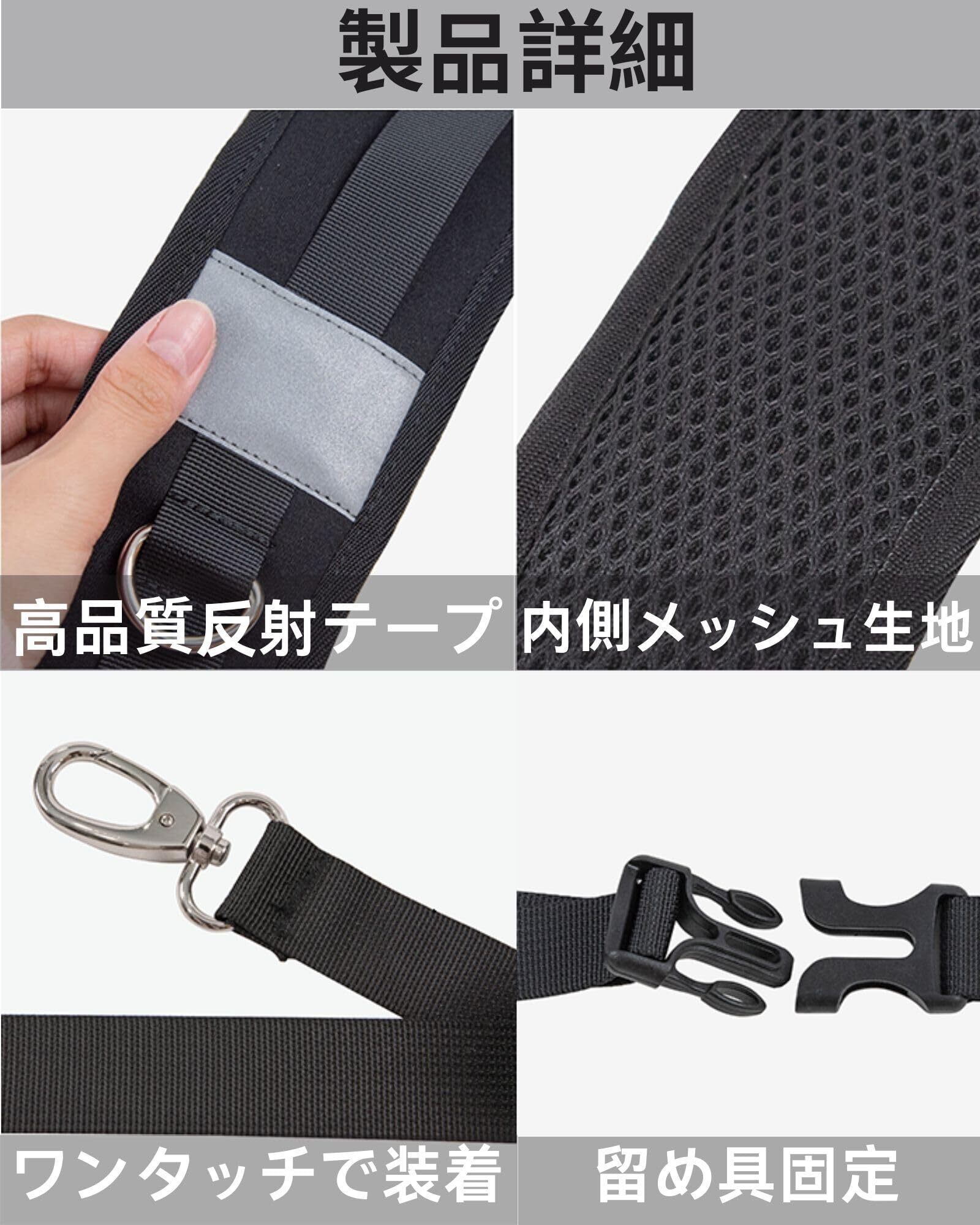 【肩ズレを防ぐ背負いベルト】肩からの背負いベルト外れ防止、肩の負担軽減に効果あります。ワンタッチなので、取付・取り外しも楽々です。リュックベルトは反射テープが付いているため夜間使用にも適しています。