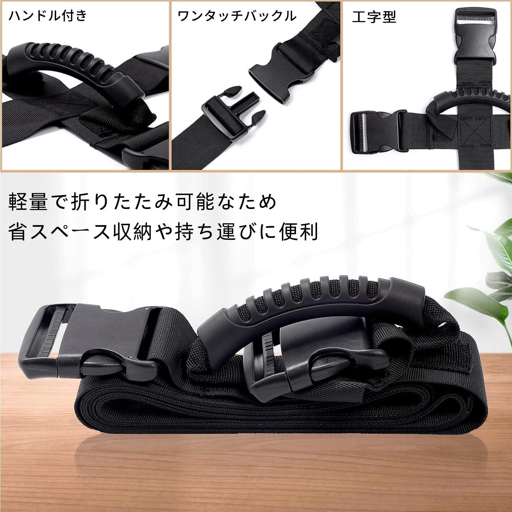 十字型のワンタッチ固定ベルトは、荷物をしっかりと固定することができ、運搬中も安心です。手提げハンドル付きで、持ち上げる際も便利です。シンプルな操作で、面倒な手間を省きます。
