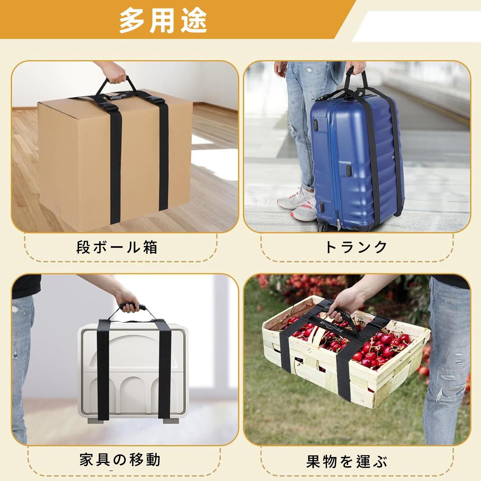 【幅広いシーンで活躍】キャリーケース ベルトはご家庭の引っ越しや倉庫での物流作業、アウトドアでの買い出し、日常の整理整頓など、幅広い場面で大活躍。特に取っ手のない箱や家具、本、薪など重い荷物の運搬に最適で、宅配業者や倉庫スタッフ、ご家庭の皆さまにおすすめです。